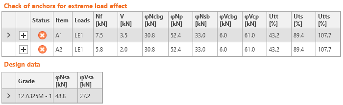 The check of anchors is provided according to ACI 318-14 – Chapter 17. Steel strength in tension and shear and pullout strength is provided for individual anchors and concrete breakout strength in tension and shear, concrete side-face blowout strength, and concrete pryout strength is provided for group of anchors. It is assumed concrete is plain and in cracked condition.