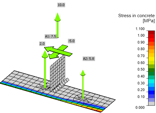 The column is loaded by tensile force 10 kN and shear forces in y and z direction, –5 kN and 2 kN. Both tensile and shear forces are acting on an eccentricity due to the position of the anchors.