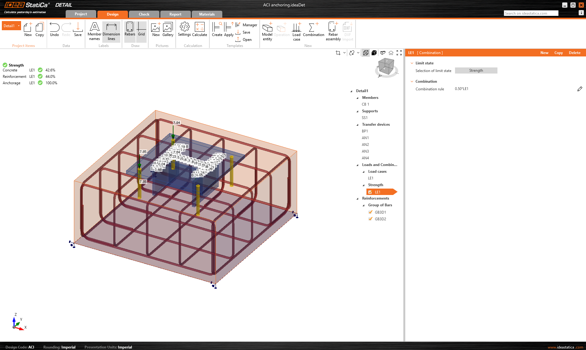 IDEA StatiCa Detail is now fully integrated with the ACI standard, now including 3D in Detail. The environment supports both imperial and metric units, and assessments are conducted in full compliance with the ACI standard.
