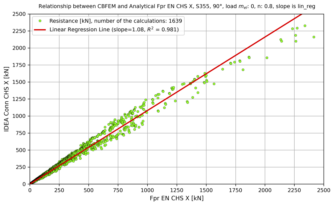 EN 1993-1-8 and AISC 360-22 produce nearly identical results, as they are based on the same methodology. The draft standard Fpr EN 1993-1-8, however, introduces improvements for circular hollow section (CHS) connections. The draft predicts a generally less conservative resistance than EN 1993-1-8—by up to 55% for the selected parameters—and its results correlate better with the component-based finite element method (CBFEM).