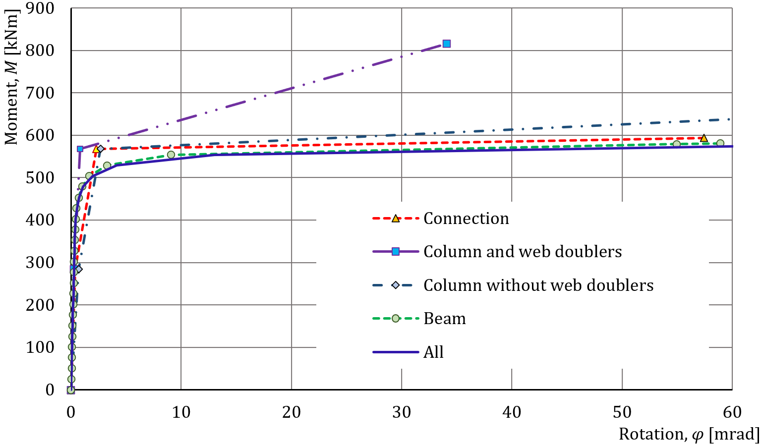 For sensitivity study, a prequalified unstiffened extended end-plate joint was selected. The beam IPE 450 is connected to column HEB 300 by an extended end plate 25 mm thick with twelve M30 10.9 bolts, with and without web doubler 10 mm thick. Steel grade S 355 was used for all plates. To determine the contribution of each macro component separately, the material diagram of the selected macro component was elastoplastic, while the rest of the joint was with only elastic material diagram. The strains at the resistance of the whole joint, the column web panel in shear with web doublers only, and the bolted end-plate connection only are compared to the beam macro-component only in Fig. 12.2.8. The influence of each macro-component on the behavior of the joint is presented in Fig. 12.2.9, where column web panel with and without web doublers is shown. The joint behavior shows higher resistance of the connection macro-component.