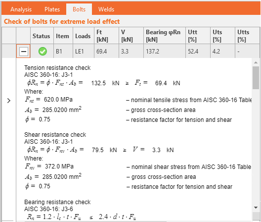 Checks of the concrete in bearing and the checks of the welds in the same way as checks of the welds anywhere in the connection was implemented to the result tables.