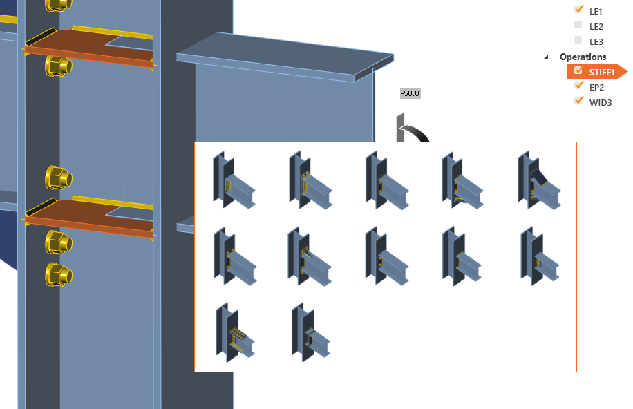 The new connection wizard will help you to design and code-check new connections. Choice of Class, Topology, and Design from pre-prepared templates allows you to define hundreds of connection types in seconds. All items are available in EC, AISC and CISC codes.