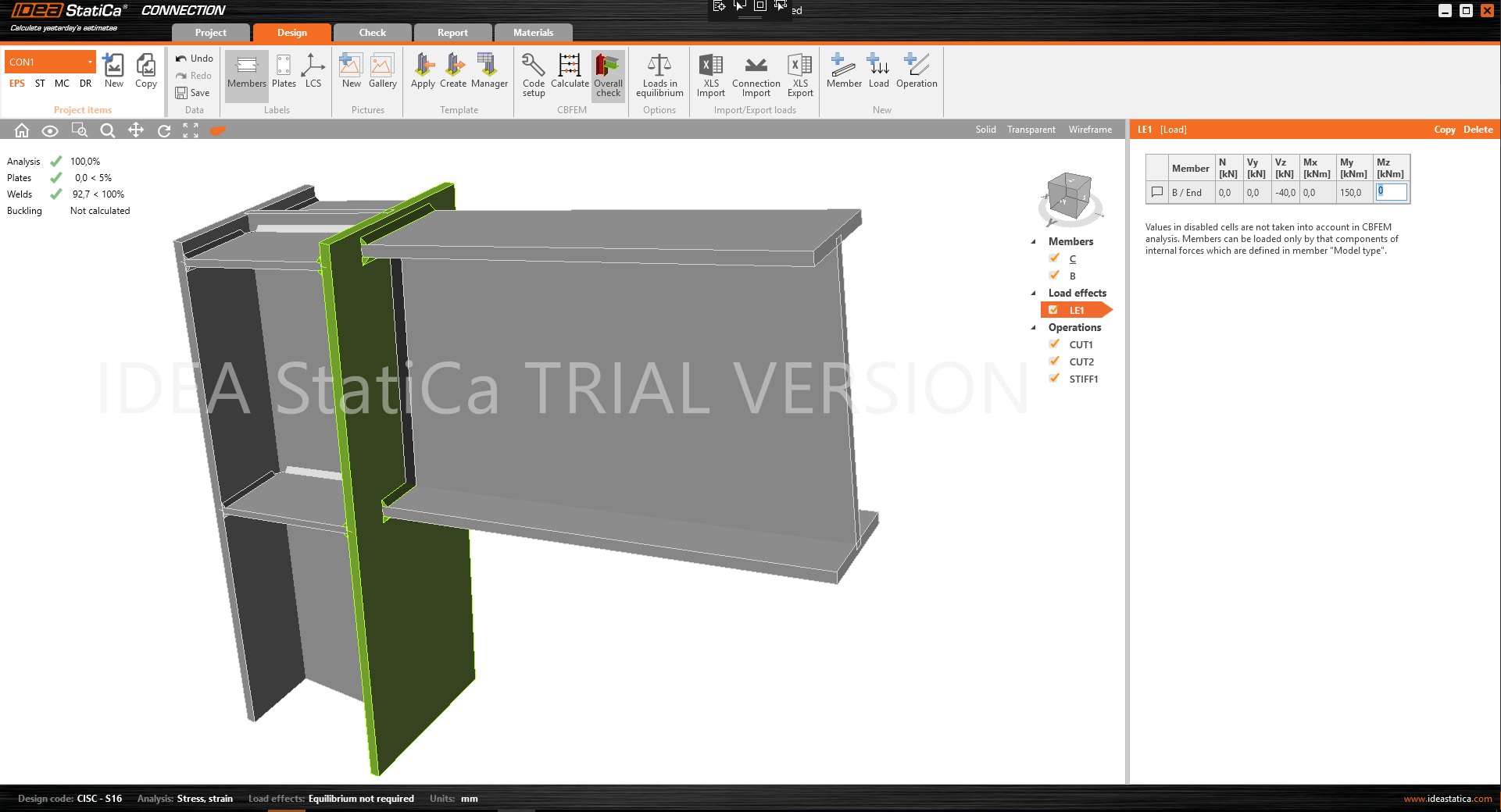 - Design tab – modify or create members, their geometry, load effects, and manufacturing operations.