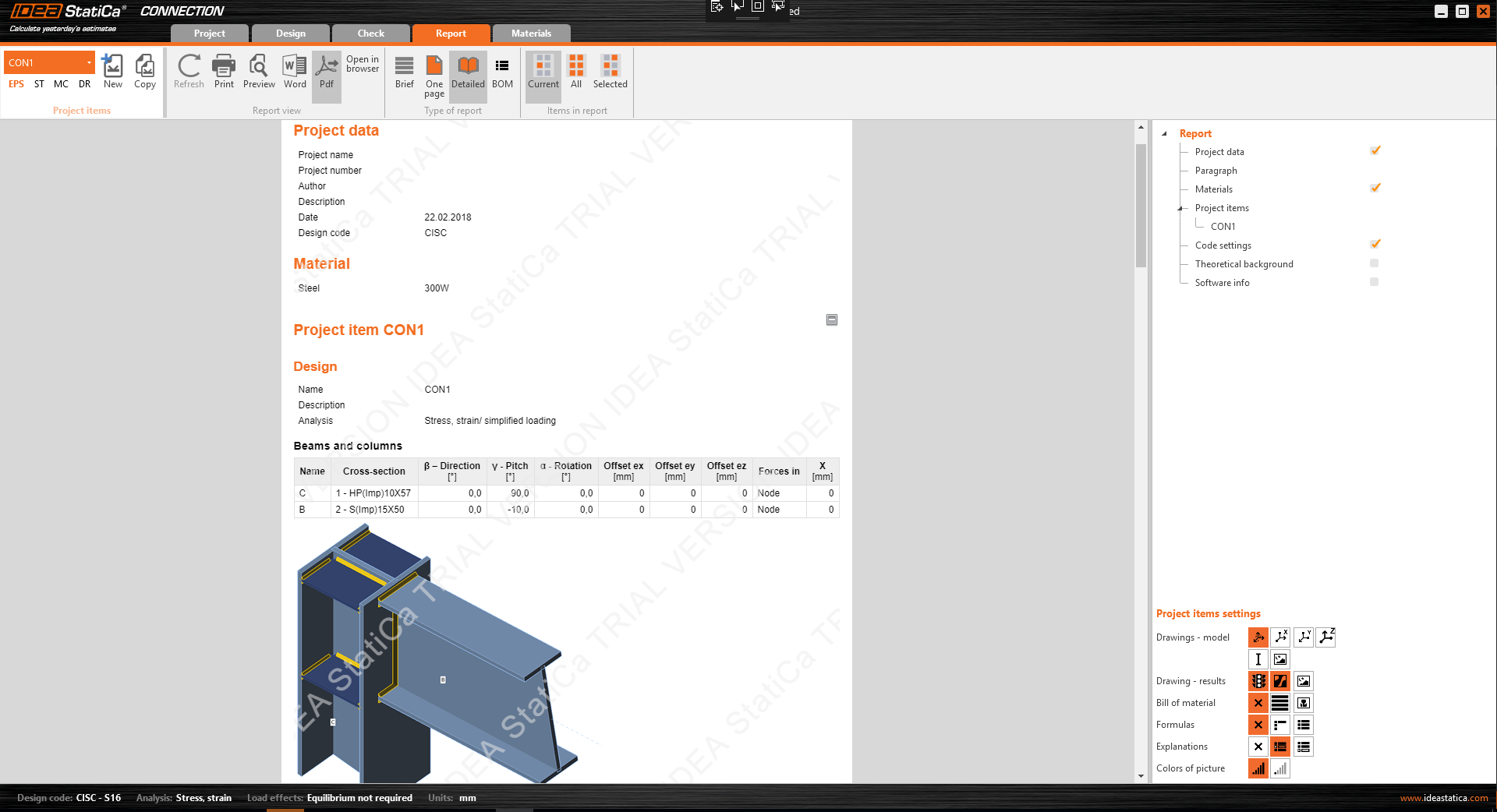 - Material tab – information about the materials, cross-sections, bolt grades and assemblies are combined.