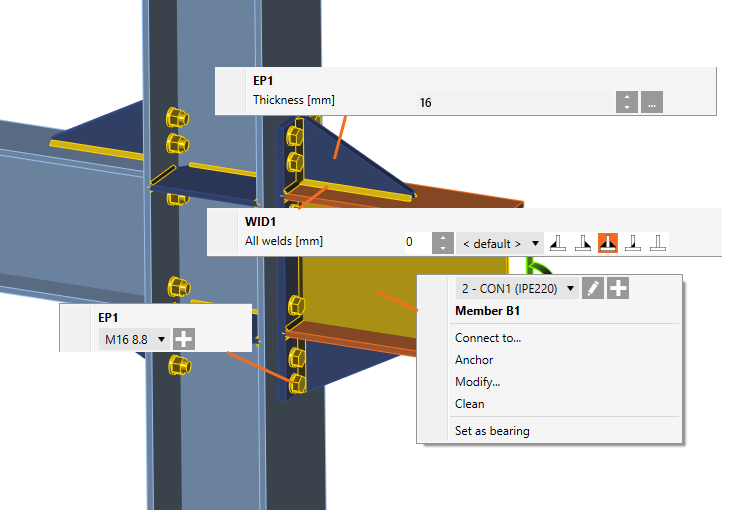 Right mouse button commands can be useful in the 3D scene as well. You can modify the member cross-section, weld, bolt, and plate thickness.