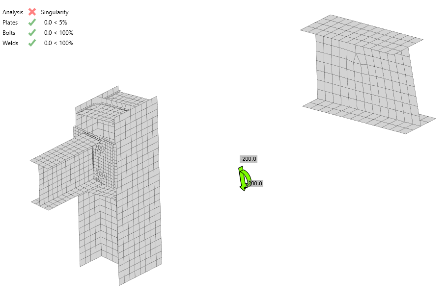 The singularity check of the model was implemented. New status in the results summary is printed and there is a model with exploded items provided in the 3D scene. In the example below, you can see the nonwelded member.