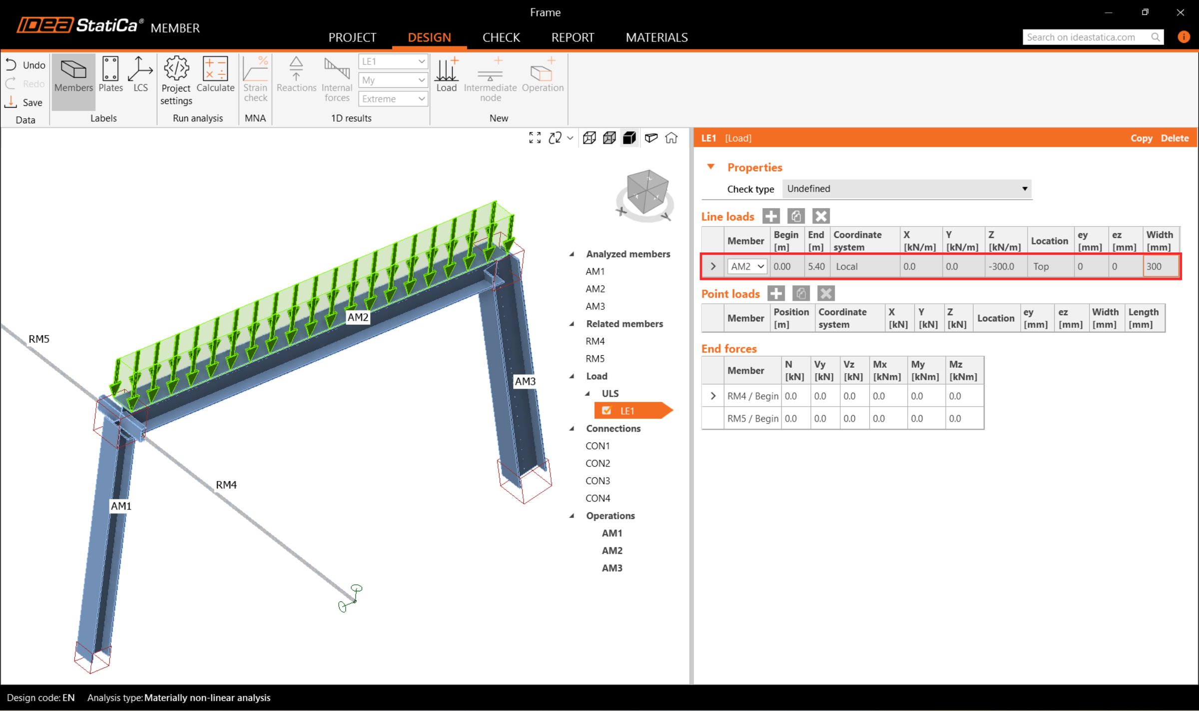 Then assign one distributed load to member AM2 and modify its magnitude to -300 kN/m and width to 300mm to match the beam.