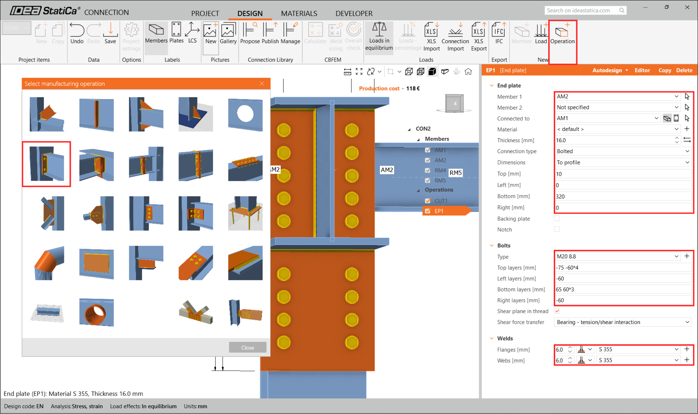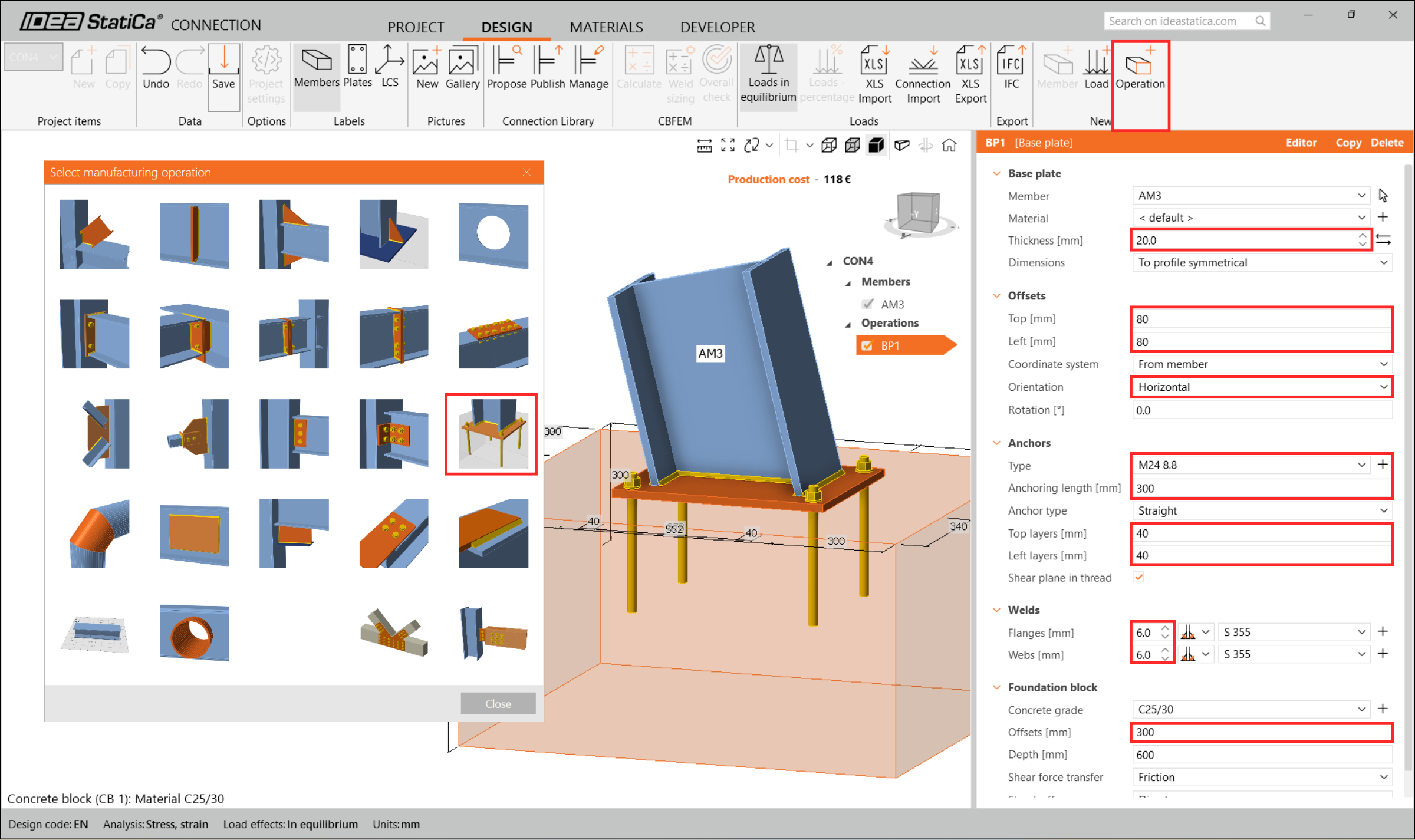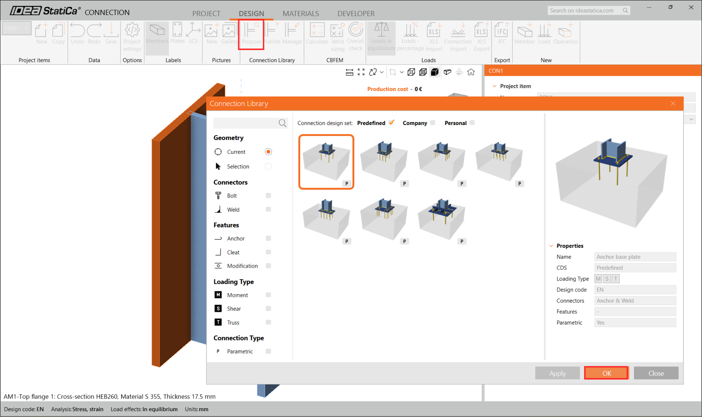 Start with joint CON1 at the left column base. IDEA StatiCa Connection application module opens, and you can design the joint by selecting one of the predefined templates.