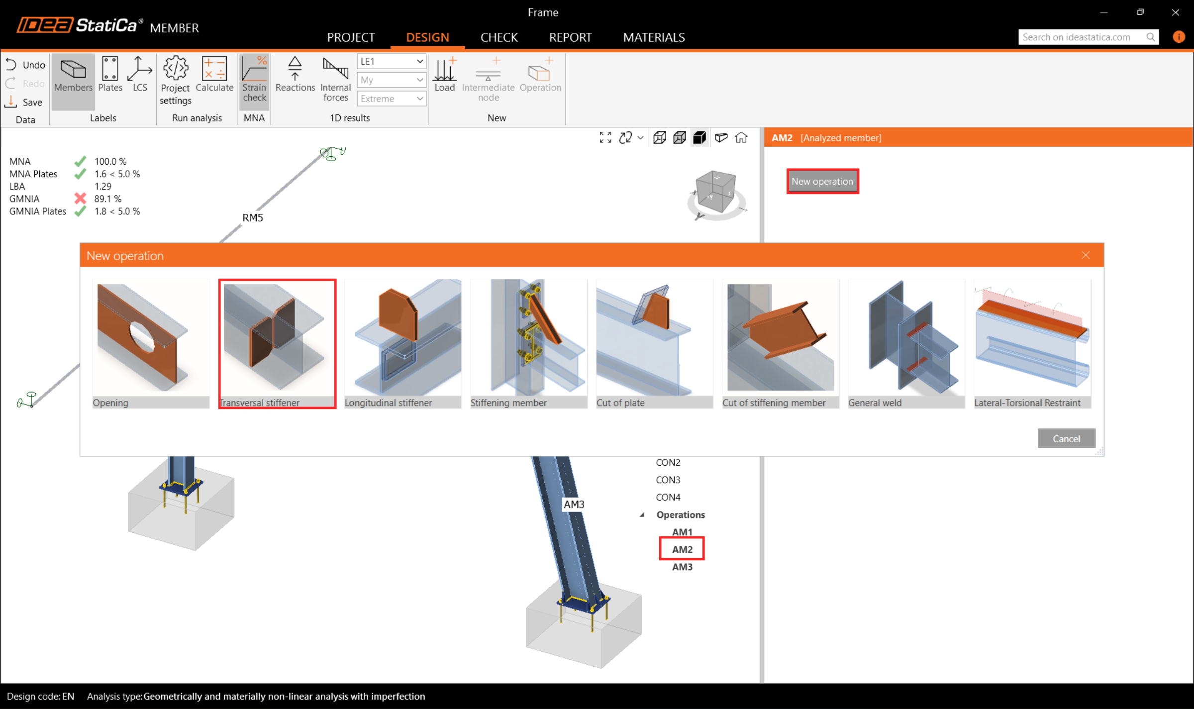 Go back to tab Design and in the tree menu, navigate to Operations, right-click on AM2, and add Transversal stiffeners to strengthen the most stressed frame corner and decrease the buckling effects.