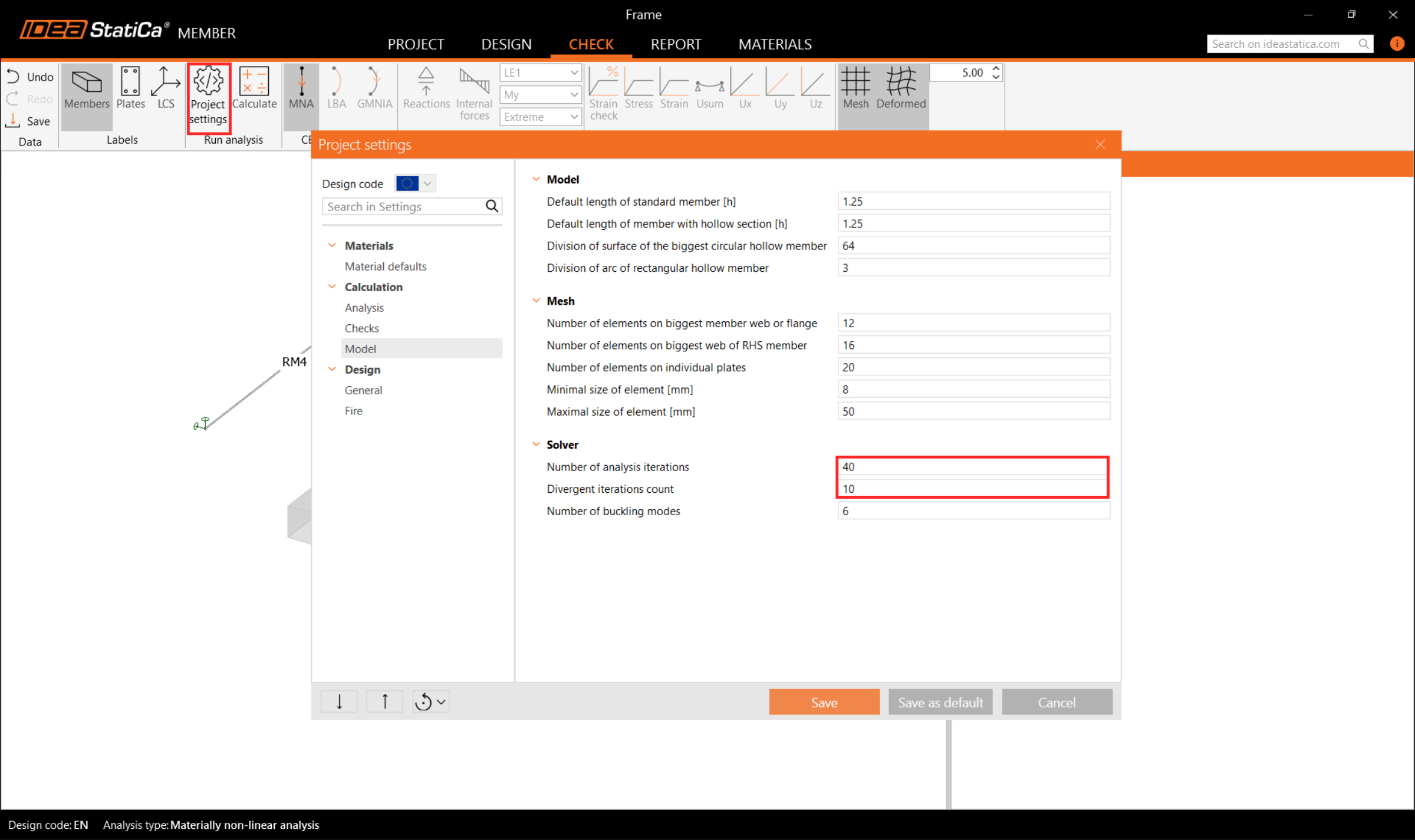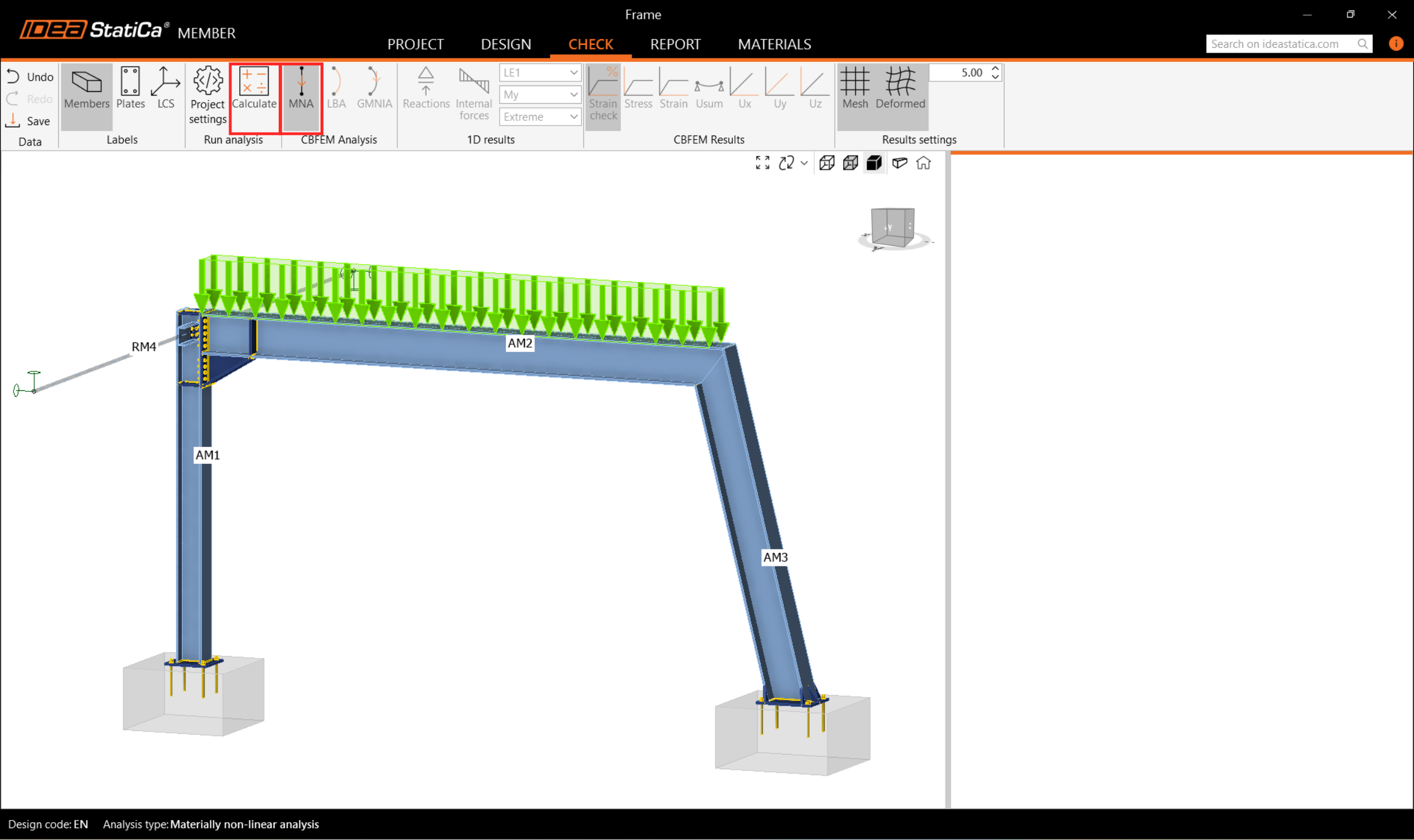 Let's proceed to the Check tab and perform the analysis. Analysis in IDEA StatiCa Member is calculated in three steps using the CBFEM technology. First, analyze the MNA (materially non-linear analysis) to check the structural capacity, then calculate the LBA (linear bifurcation analysis) to investigate the structural stability and finally input the initial imperfections to appropriate buckling shapes and calculate the GMNIA (geometrically and materially non-linear analysis).