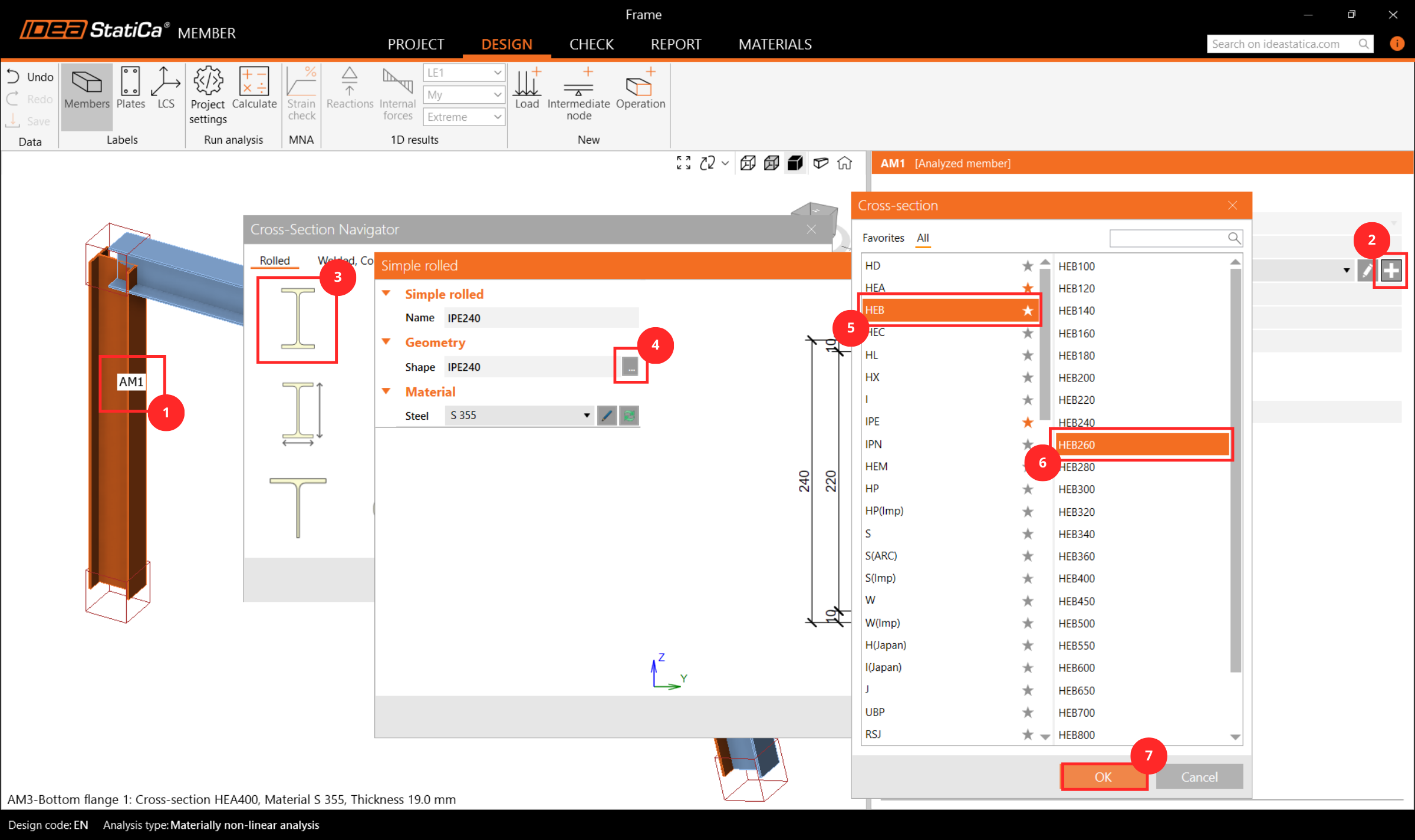 Here you can see and change the parameters of the added members for the analysis. Change the cross-section of column AM1 to HEB260.