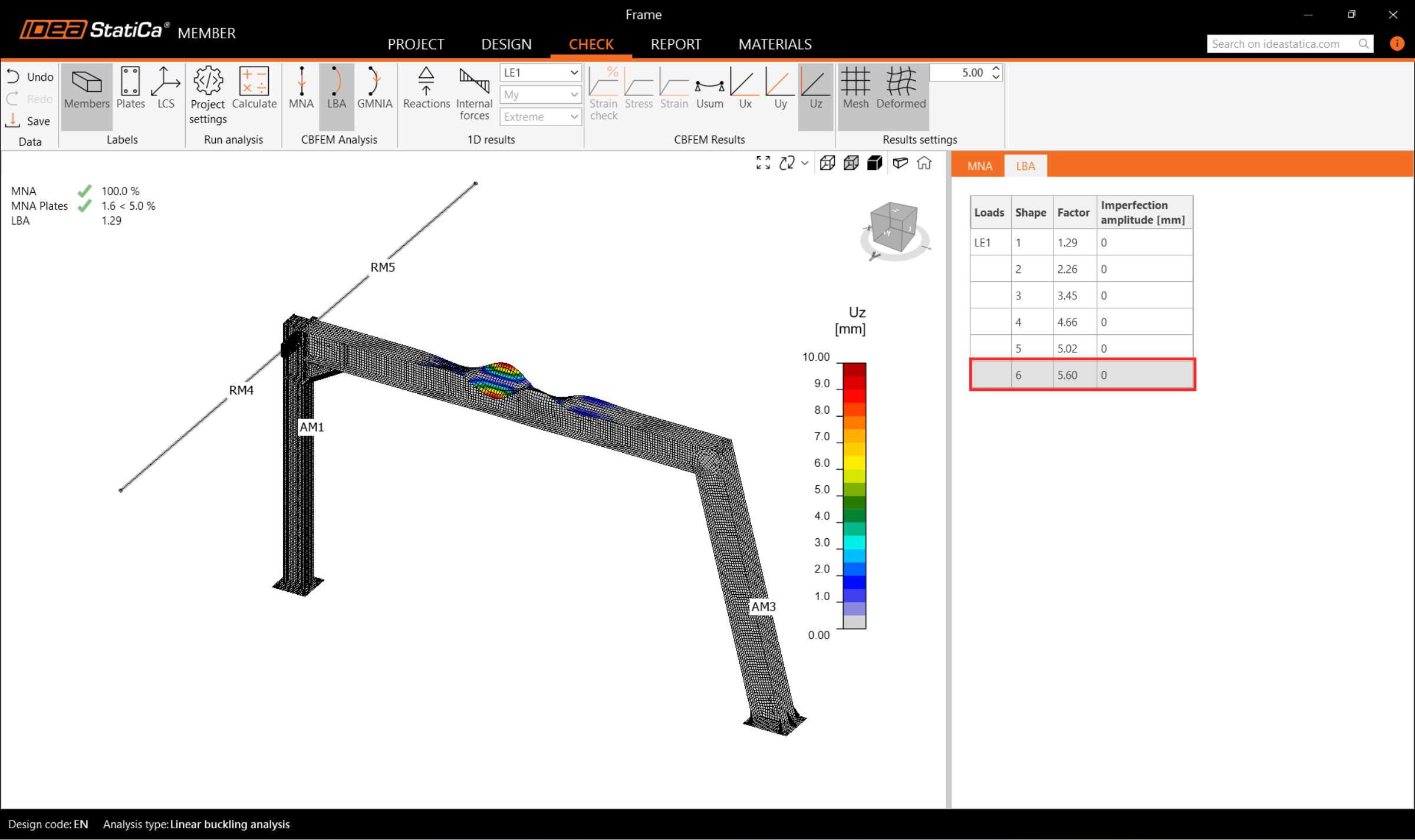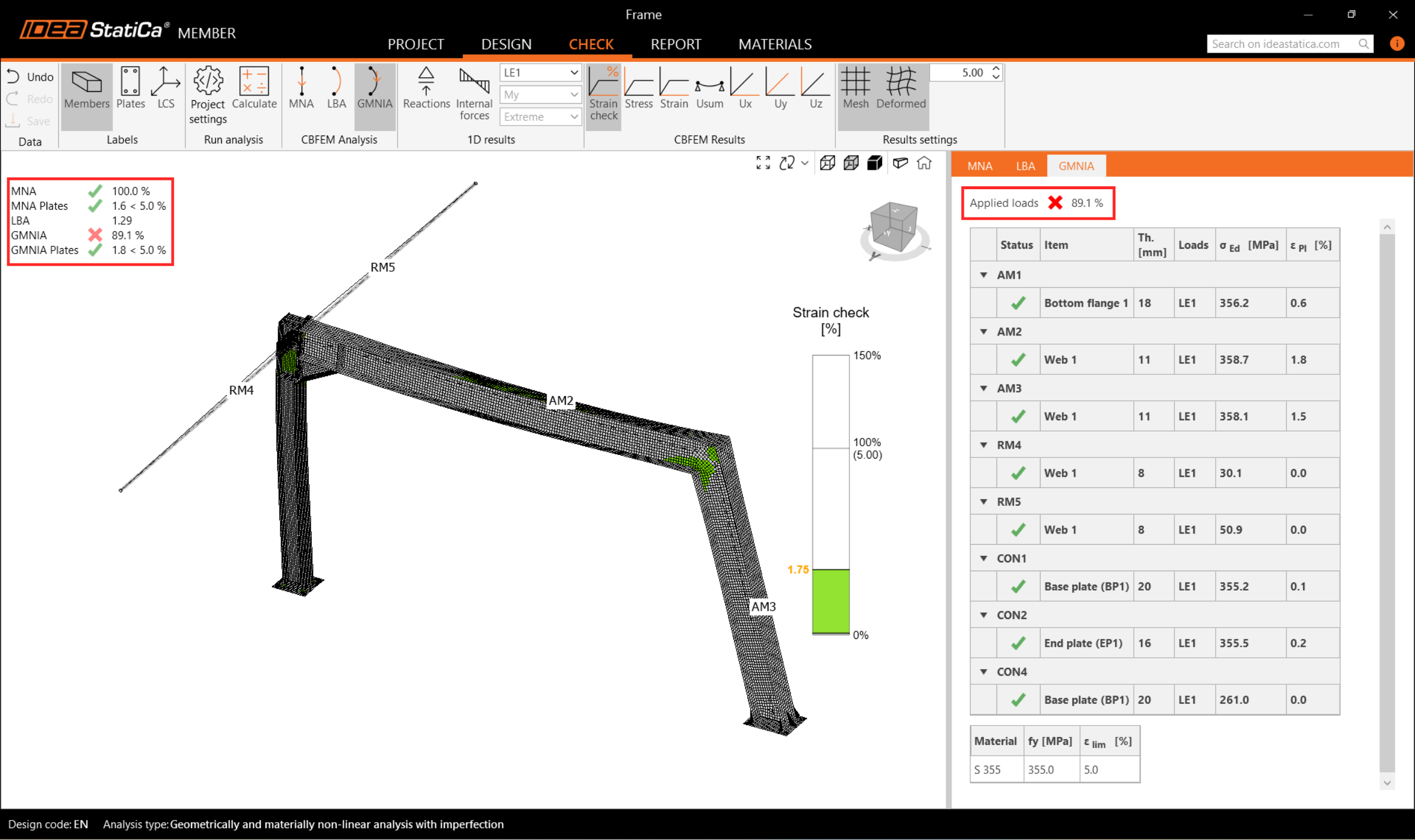 As you browse the results, you can notice that the GMNIA applied loads have not reached 100%, which means under given loads, the structure loses stability. In order to pass the stability checks, you need to strengthen the frame.