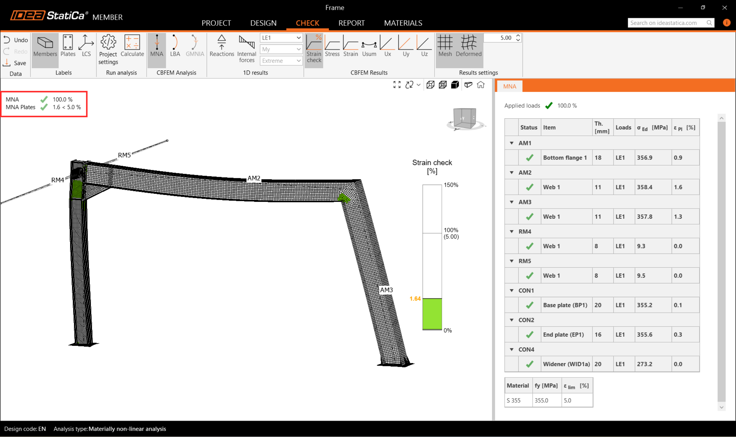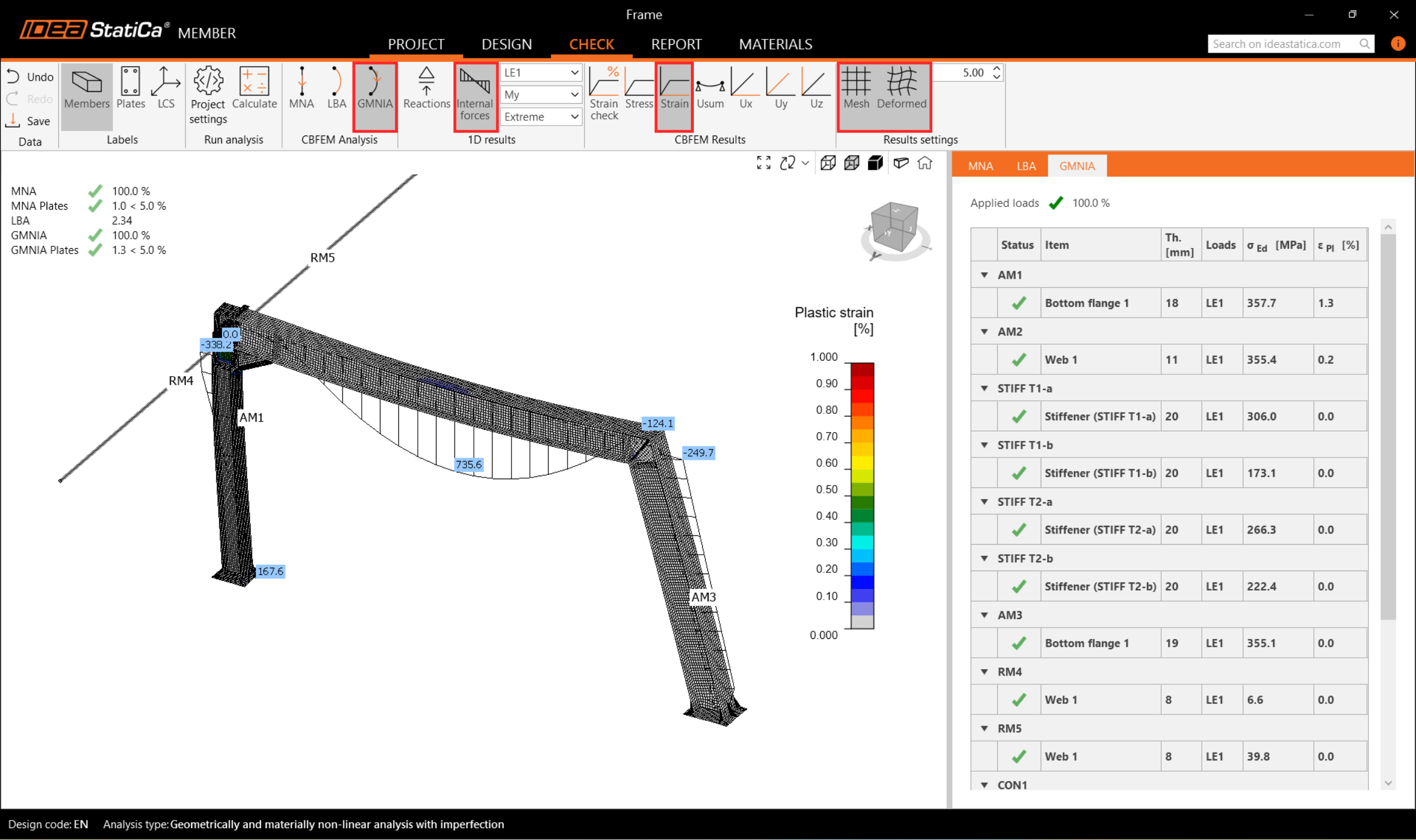Now go back to tab Check and repeat the calculation in three steps - MNA, LBA, GMNIA. The designed frame passed the stability code-checks with applied initial imperfections, and you can browse the results such as strain distribution and internal forces diagram.