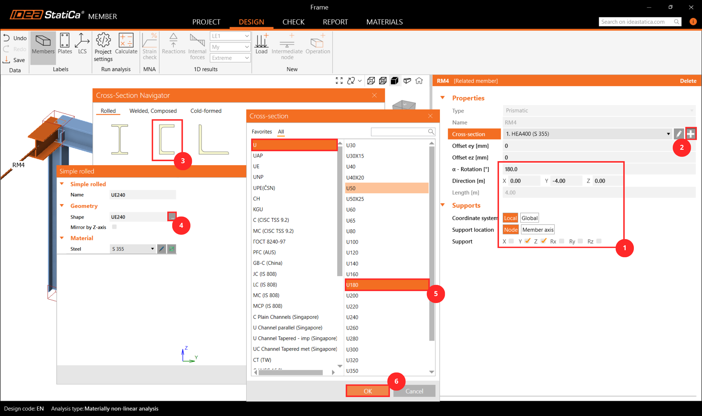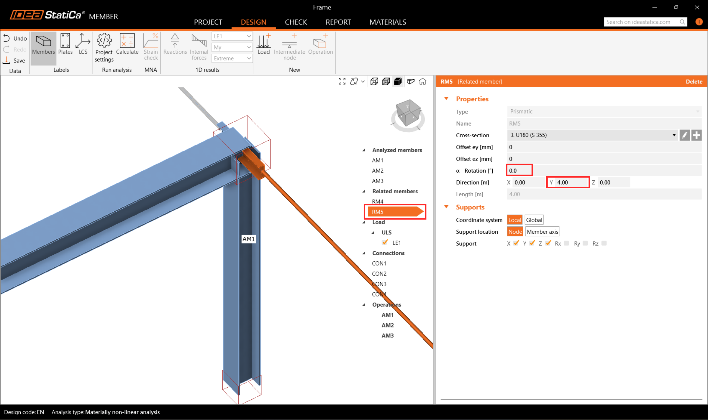 Then select the related member RM4 either in the 3D scene or in the tree list and modify its properties as cross-section, length, orientation, and supports at the free ends.