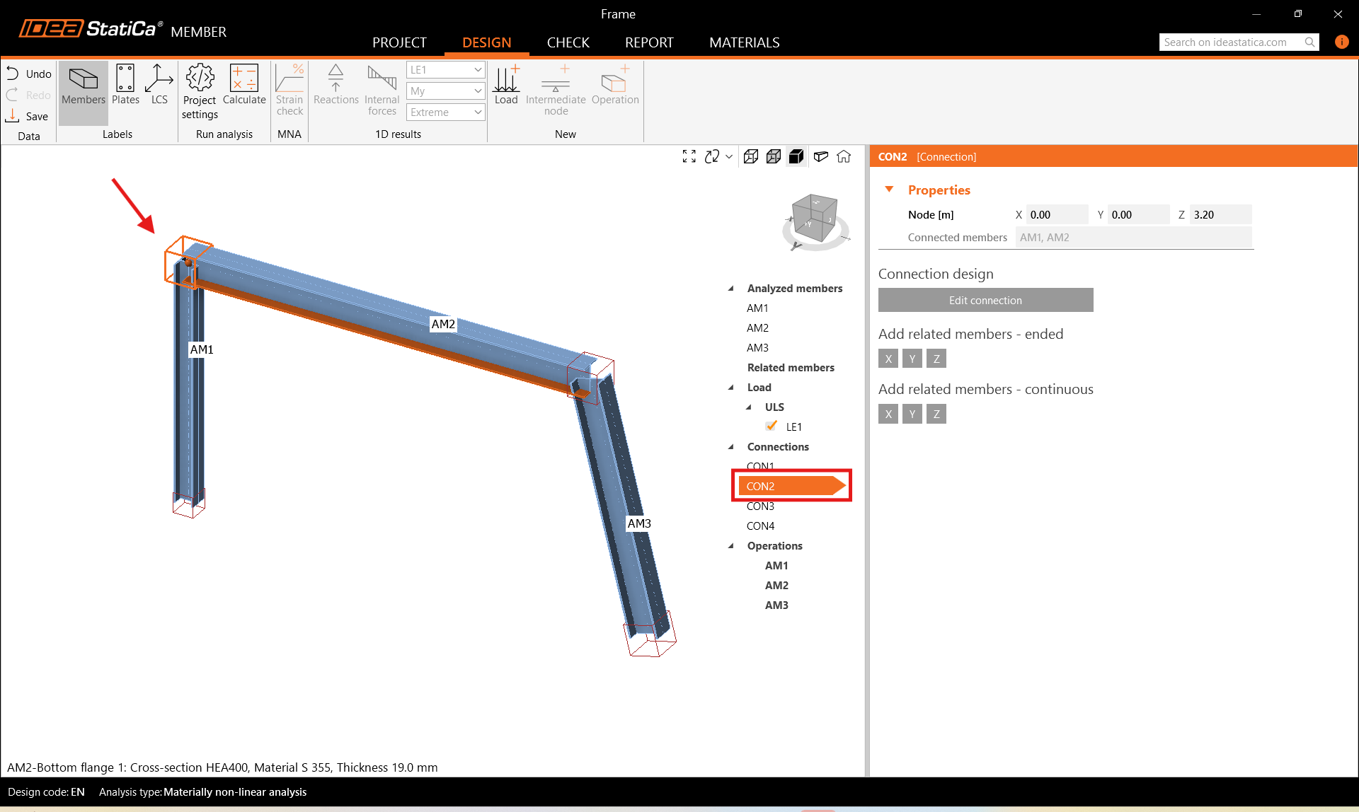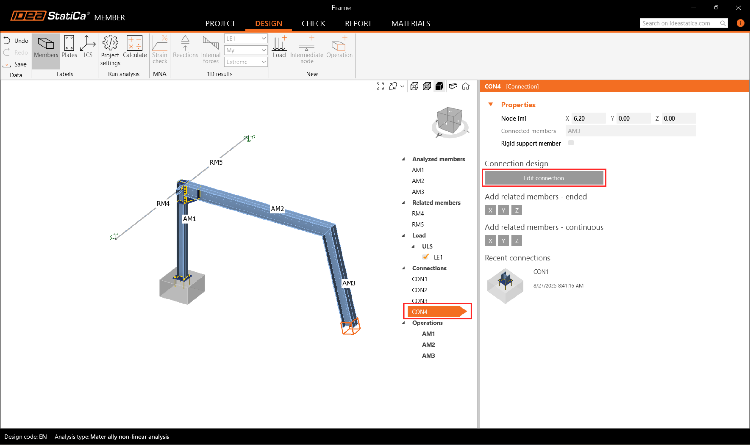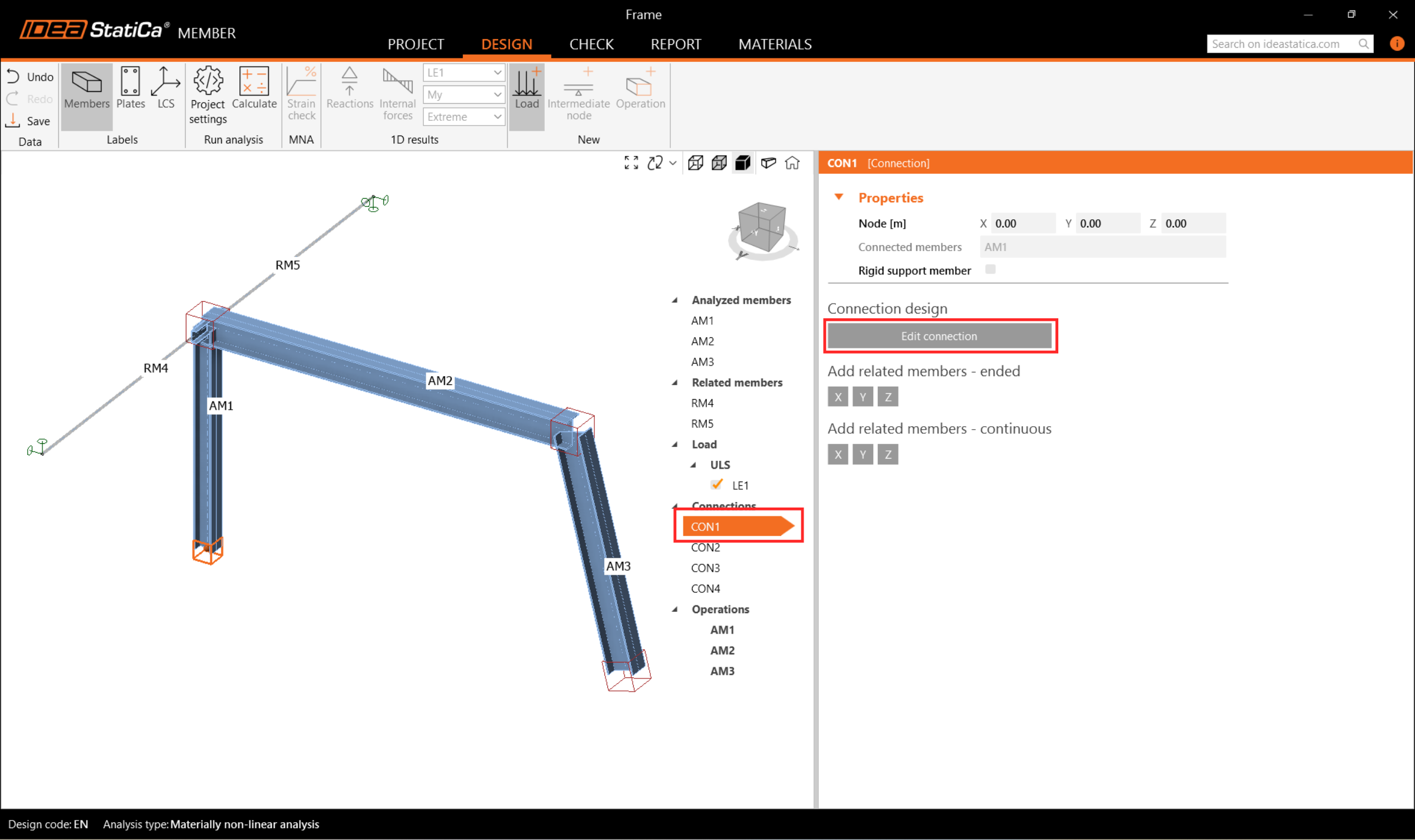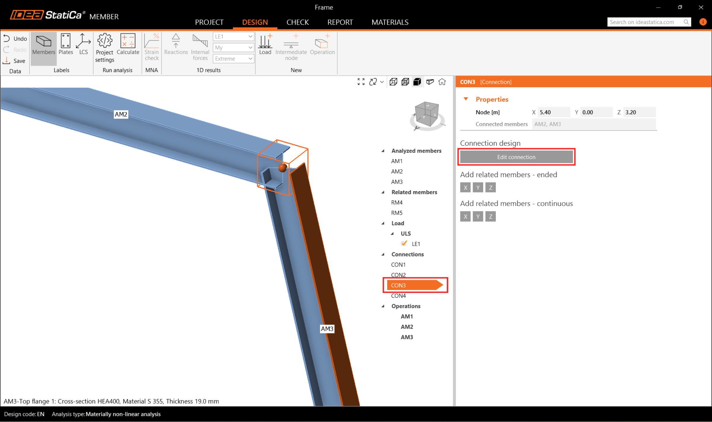 Next, choose the joint CON2 and click on 'Edit Connection' within the IDEA StatiCa Connection module.