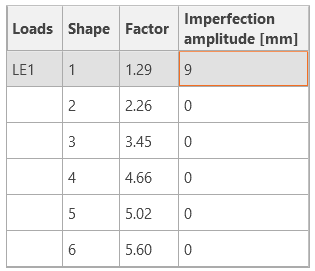 Since at least one of the buckling shape factors is less than 15, switch to GMNIA to perform the non-linear analysis of structural stability. According to EN 1993-1-1, choose the most critical buckling shape or a combination of buckling shapes and input the initial imperfection of the critical beam. In this case, choose the first buckling shape 1 as the most critical one. Switch to the GMNIA tab in the right panel and determine the imperfection of 9 mm (0,5xL/300 = 0,5*5400/300 = 9 mm), which you type in as the Amplitude in column 1
