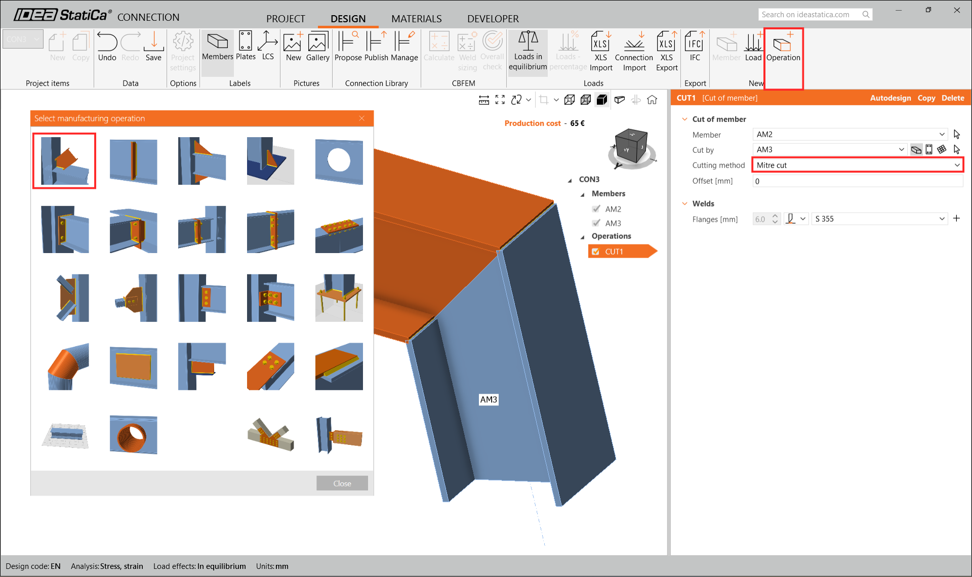 Here, add just one operation Cut and set the cutting method to Mitre Cut to create a rigid connection.