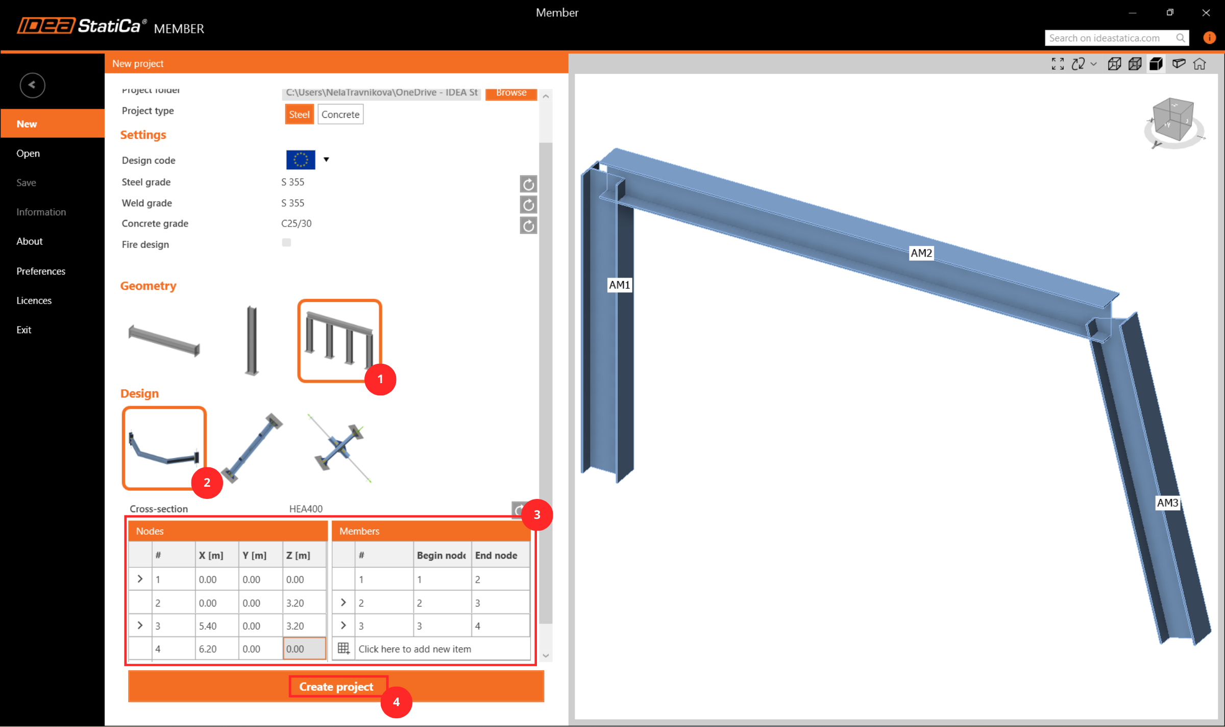 Create a new project, type its name and select a folder where it will be saved. Then choose the design code, starting material properties, and the type of topology. Add nodes coordinates of the structural detail and add members within these nodes. Finally, click on Create Project and start modeling the structural detail.