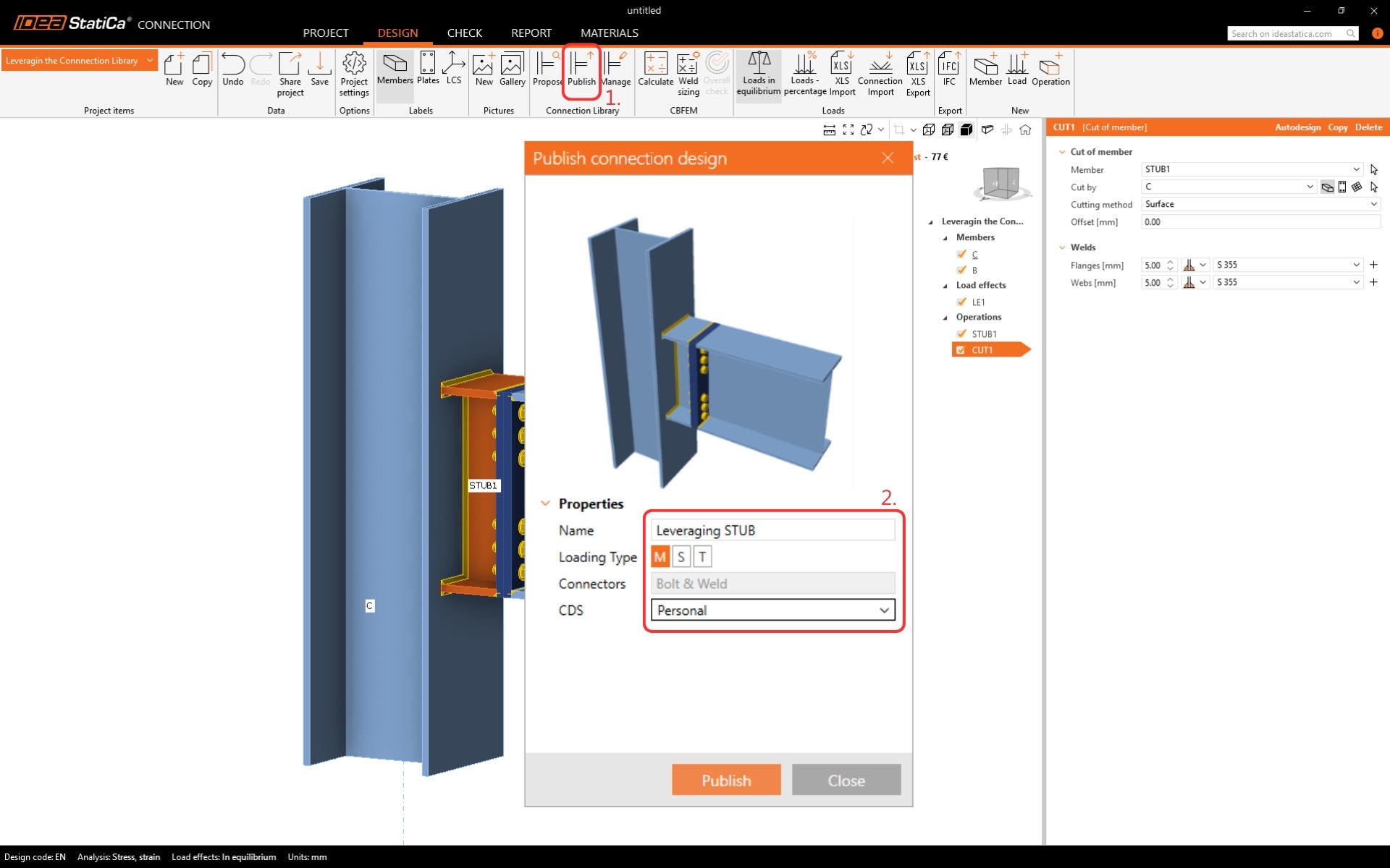 This design is used often; therefore, it can be saved to the Connection Library. Click on the Publish button in the ribbon. Define the Name, Loading type, and Connection design set (CDC) in which the template will be stored. Types of CDC: