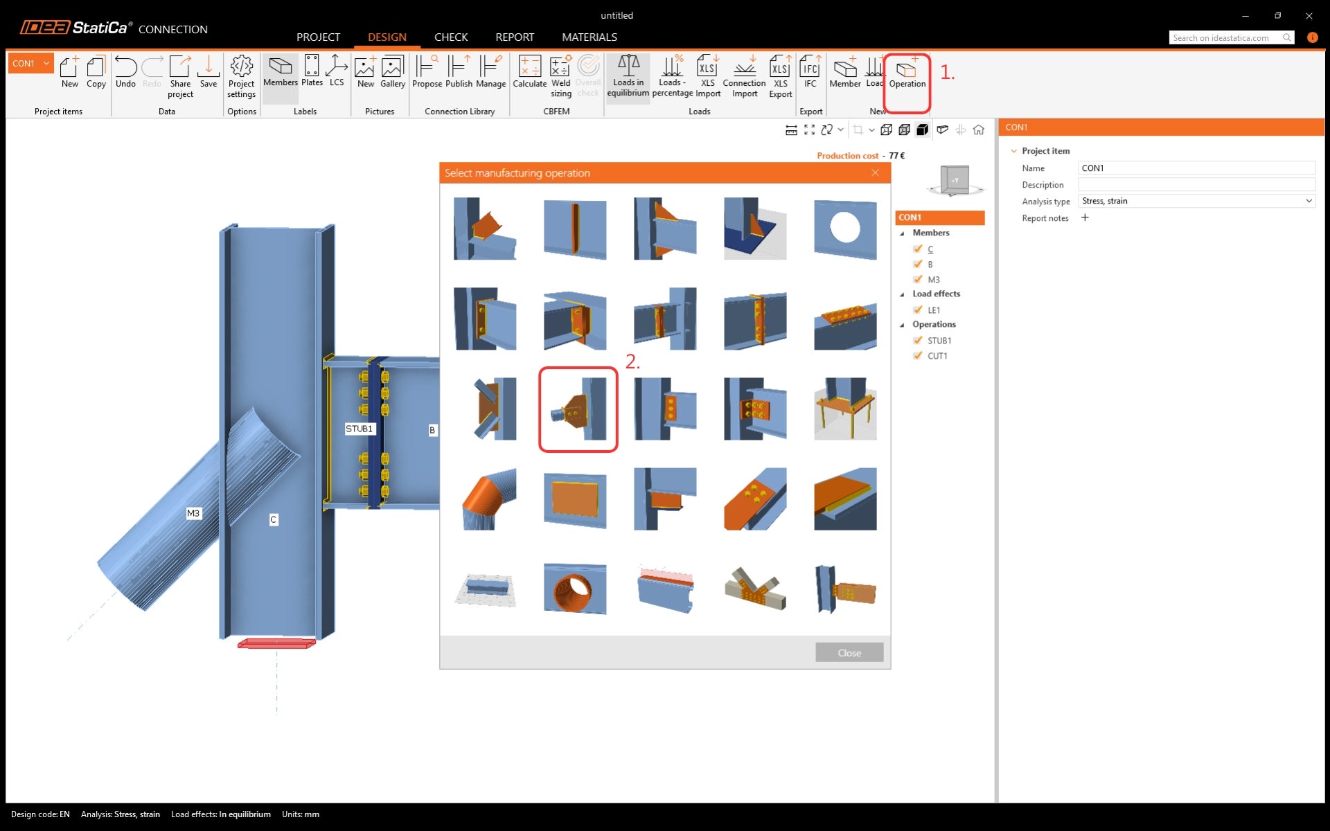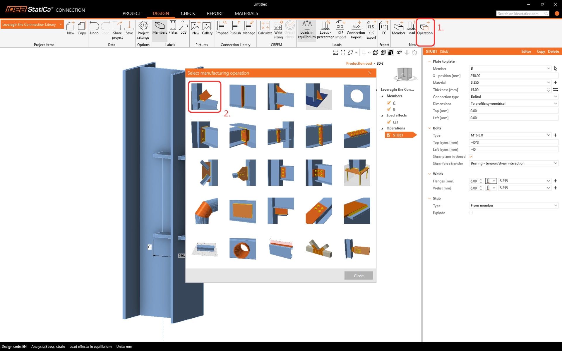 Let's create a design that can be saved as a template. Click on Operation in the Ribbon and find the manufacturing operation Stub - plate to plate.