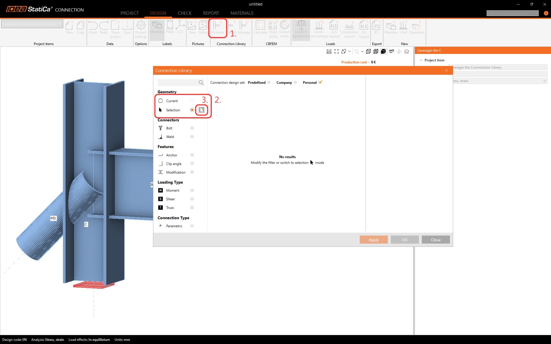 While holding the Control button on your keyboard, select members B and C. Confirm the selection by clicking on the Tick button. Suitable design templates are showcased for the selected geometry. Narrow down the selection of templates by only selecting the Personal connection design set. Apply the template.