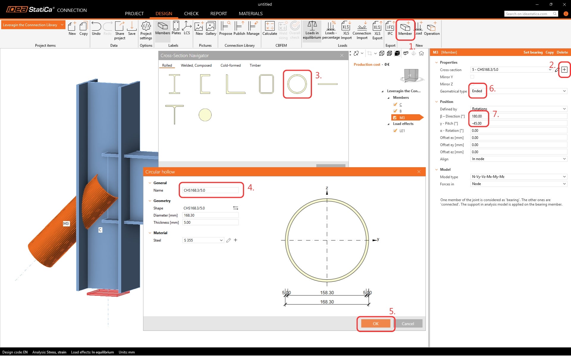 Let’s launch IDEA StatiCa and select the application Connection (download the newest version). Create a new blank design by selecting the desired geometry. Fill in the name, and choose the design code and default material properties.