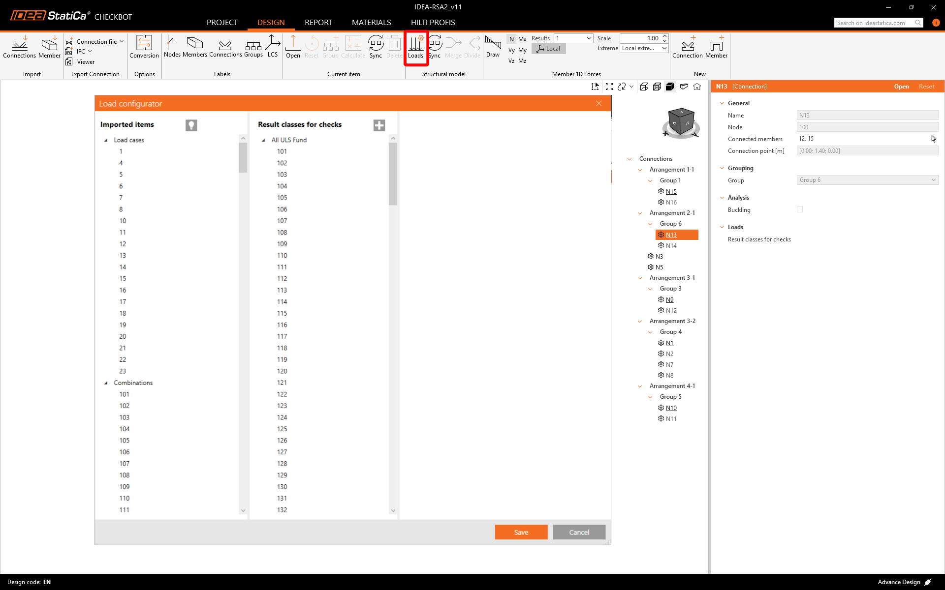 Before designing and analyzing the connections, you can activate Calculate load extremes for any group. This allows you to design and check the connections faster for only critical load effects.