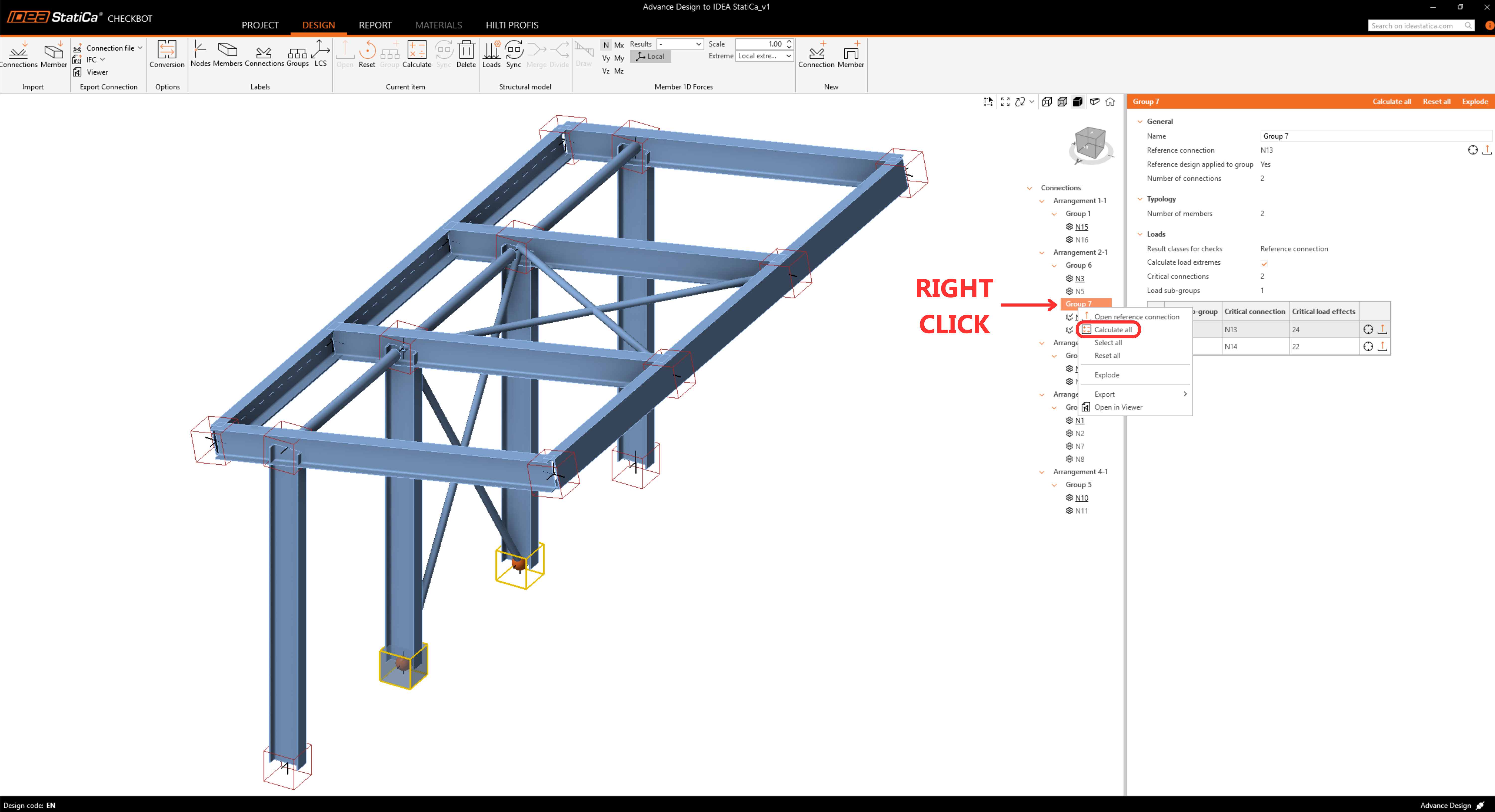 To verify the structural integrity of the imported connections, select the entire group, unselect Calculate load extremes, right-click on a Group 7, and click Calculate all. This triggers a batch analysis for all selected items.