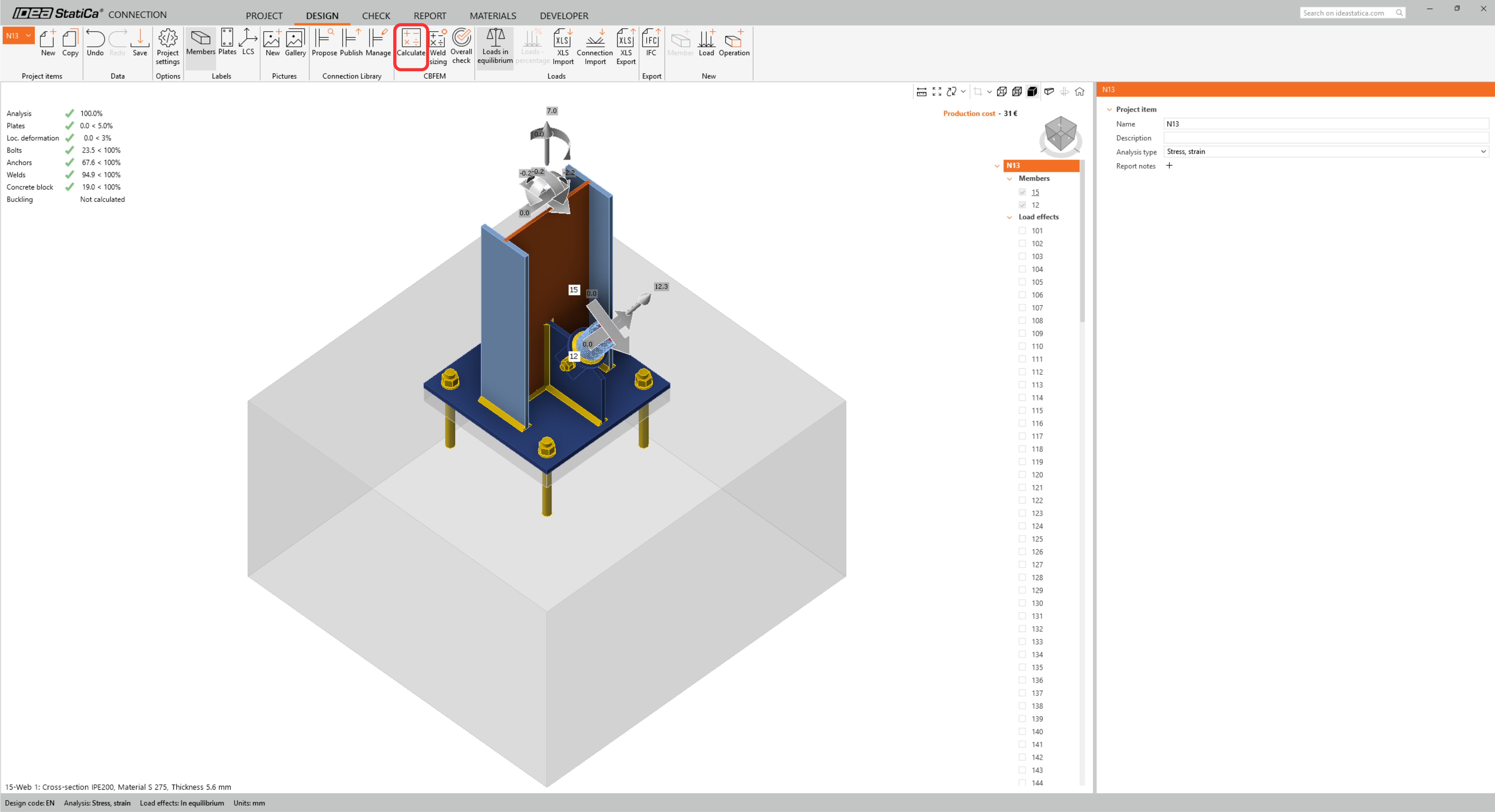 Now run a code-check using the Calculate icon in the CBFEM panel from the top ribbon. Within IDEA StatiCa Connection, you can carry out many different types of analysis and code checks.