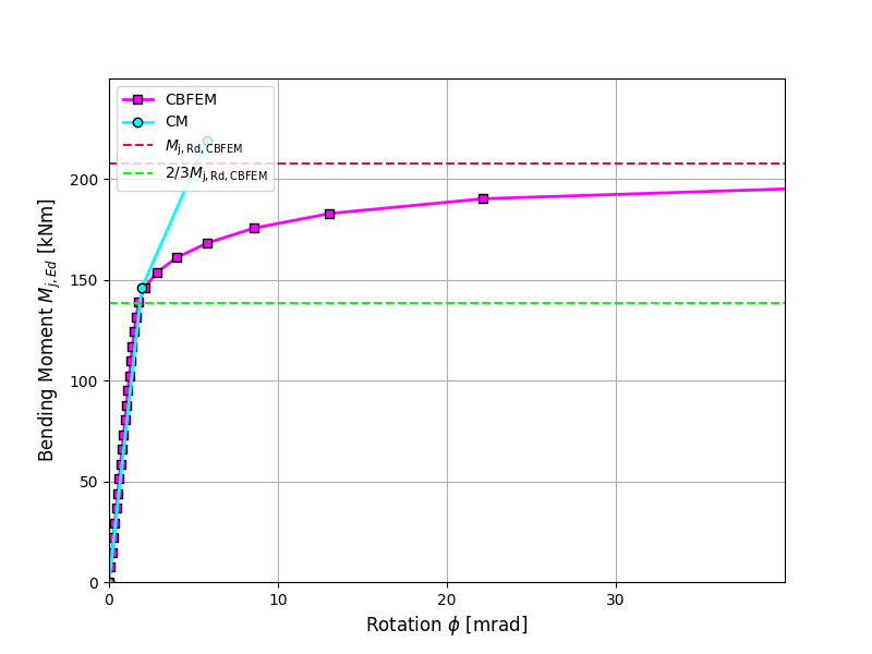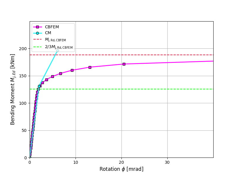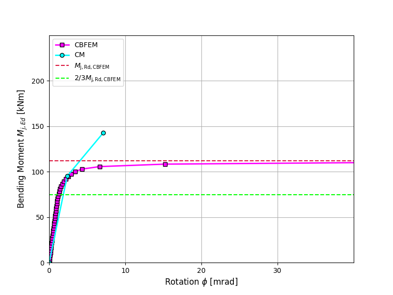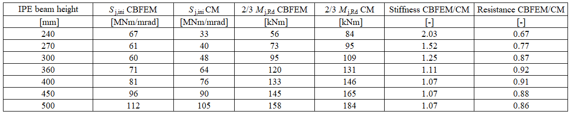 The rotational stiffness calculated by CBFEM is compared with CM. The comparison shows good agreement in initial stiffness and correspondence of joint behavior. The calculated stiffness from CBFEM and CM are summarised in Tab. 10.1.3.