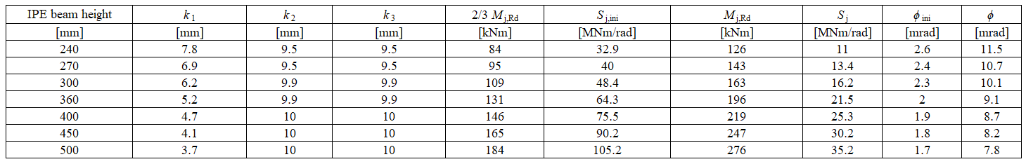 The joint components that are taken into account in this example are column web panel in shear k1, column web in compression k2, and column web in tension k3. The stiffness coefficients are defined in Table 6.11 in EN 1993-1-8:2005. The initial stiffness Sj,ini is obtained for a moment Mj,Ed 2/3 Mj,Rd.