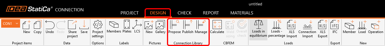 You can find the Connection Library icons in the main ribbon in the Design tab, represented by the Propose, Publish, and Manage commands.