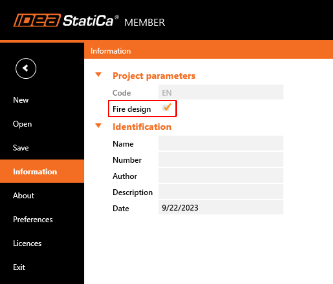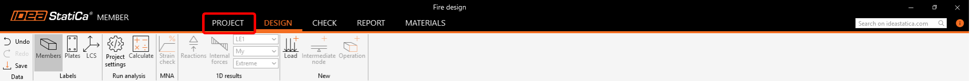 To calculate the Fire design, enable this feature by clicking on the top ribbon Project button and ticking the Fire design checkbox in the information.