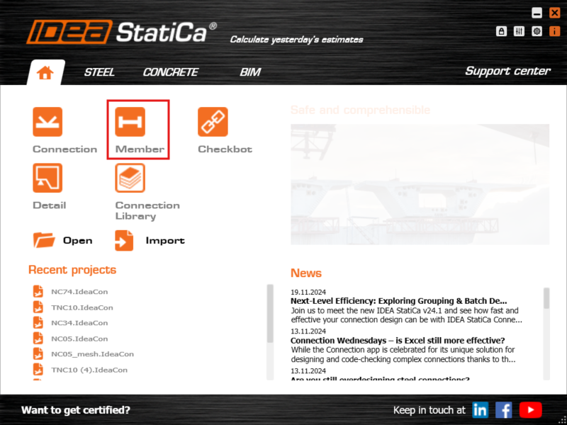 Launch IDEA StatiCa (download the newest version) and select the Member application.