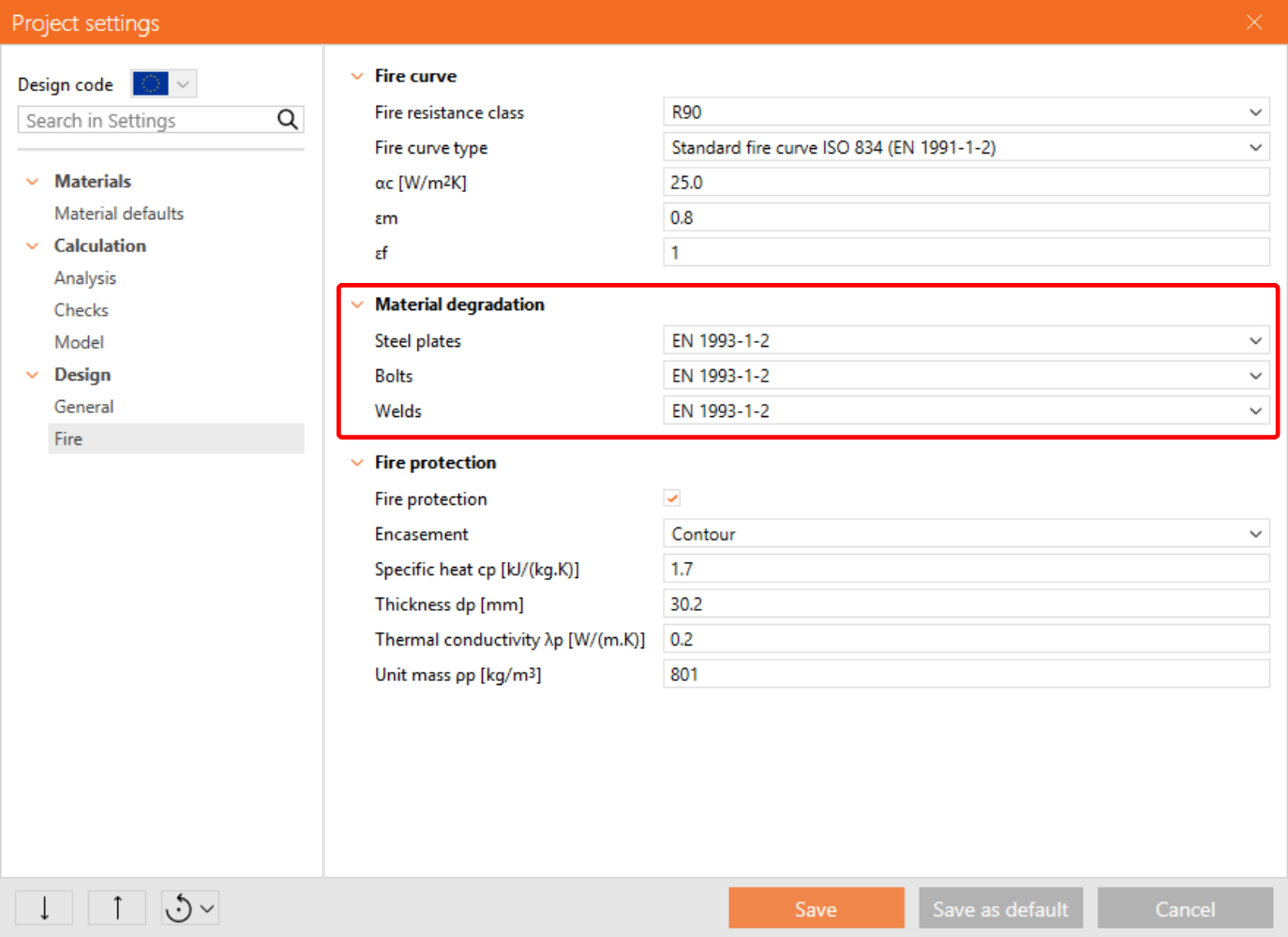 Click on the type Fire and choose Fire curve. Here you can select the Fire resistance class, Fire curve type, etc.