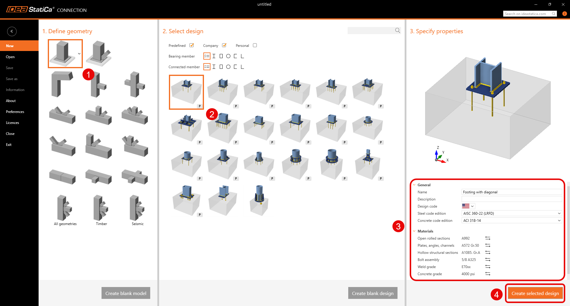 Let’s launch IDEA StatiCa and select application Connection. Create a new project by selecting a starting template closest to the desired design, filling in the name, and choosing the design code and default material properties – A992.