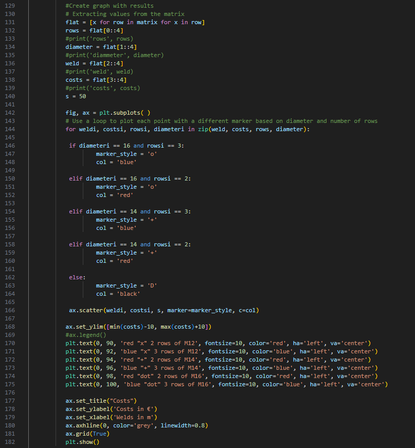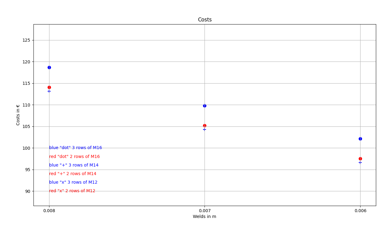 We want to optimize the connection's components (welds, diameter, and number of bolts). The result of the optimization is the joint's costs, which are neatly presented in a graph.