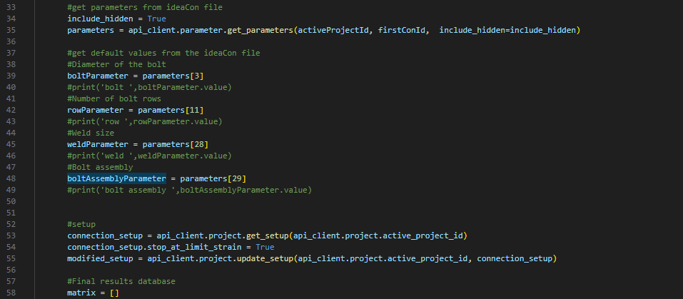 - Retrieve all needed parameters from the ideaCon (number of bolts, diameter, weld size, bolt assembly)