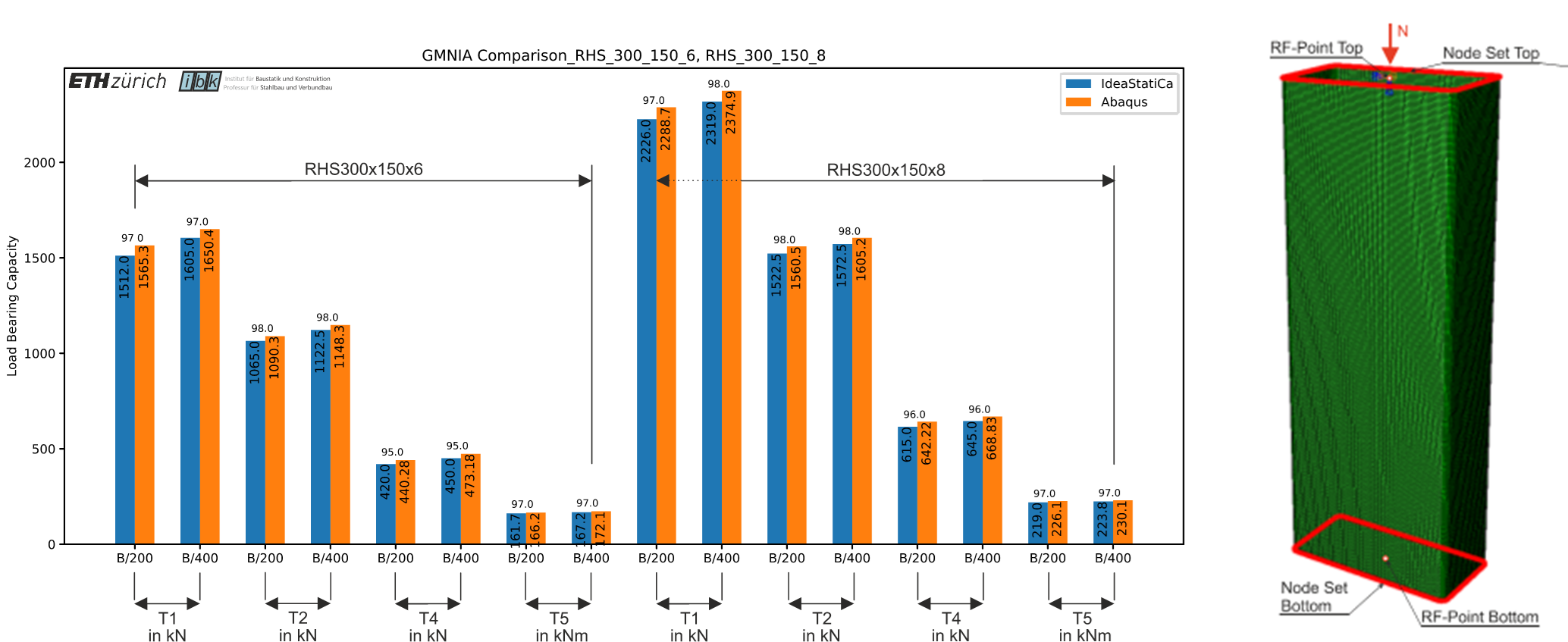 Local buckling was investigated in cooperation with ETH in Zurich with Prof. Andreas Taras and his team. Rectangular hollow sections are investigated and compared to ABAQUS models used for the formulation of 2nd generation Eurocodes. The results show the finite elements in IDEA StatiCa Member provide very similar results to these in ABAQUS. The results of LBA and GMNIA are nearly identical with the biggest difference of 5%. Also, it was shown that class 4 sections may be safely used with correct settings of initial imperfections.