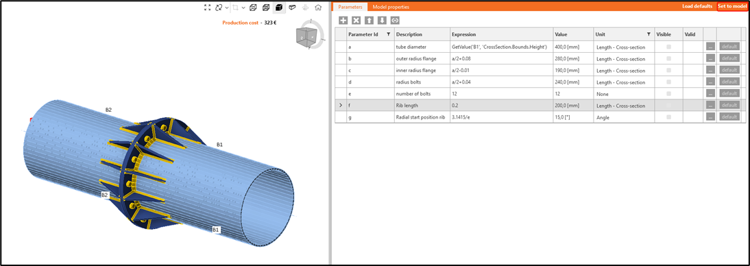 Click “Set to model” and see how the Connection changes based on the input parameters: