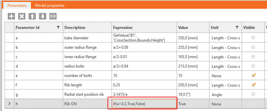 You can also use Boolean operators. Create a new parameter h with description “Rib ON” and give it as expression “True”. Set it also to Visible: