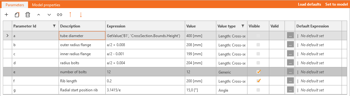 Go to the Developer tab and create 7 new parameters, assign them a parameter Id from “a” to “g”. Each parameter can be given a description and expression. This way, certain parameters can be made dependent on each other. Set the right unit for each parameter: