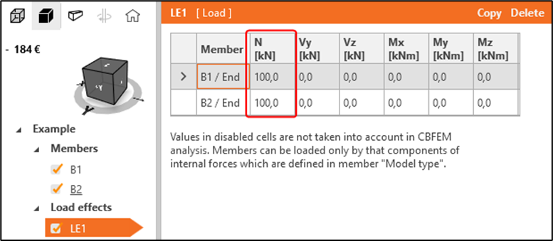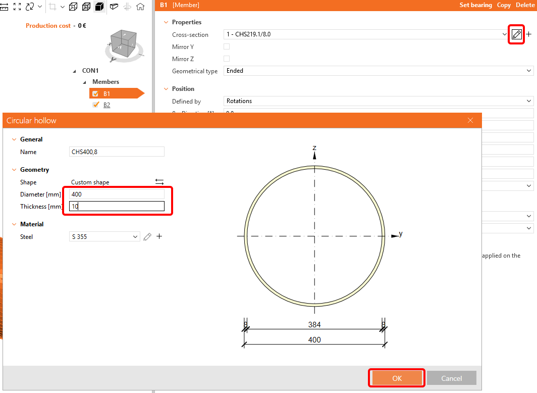 Change the dimensions of the cross section for B1 and B2 to d = 400 mm and t = 10 mm: