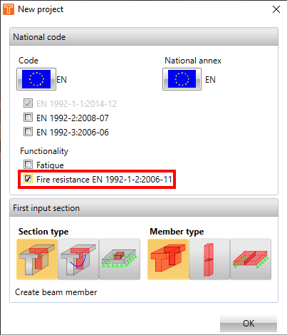 The new functionality of the fire resistance according to EN 1992-1-2: 2006 – 11 is implemented in the code-check of the RCS application. The check is available for the member types slab, wall, beam, and column. When code-checking a member to fire resistance, a tabulated data method is used, which is a sufficient approach for the majority of the structures. The functionality can be selected during the creation of a new project in the wizard, where the member type is chosen as well (Fig.9). Additionally, projects created in older versions can be checked to fire resistance, too. Regarding the national annexes, the general Eurocode is supported only.