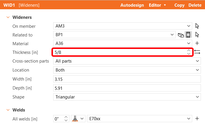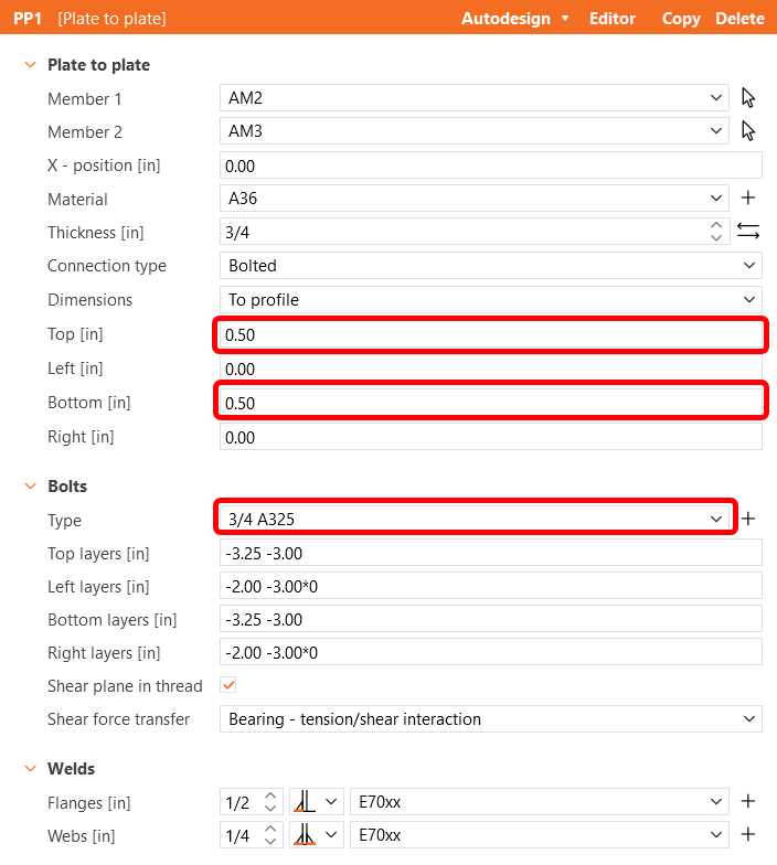 Select weld type E70xx, steel type A36 and concrete type 4000psi.