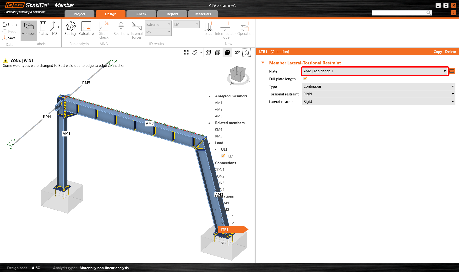 Start with joint CON1 at the left column base. IDEA StatiCa Connection application module opens, and you can design the joint by adding the manufacturing operations.