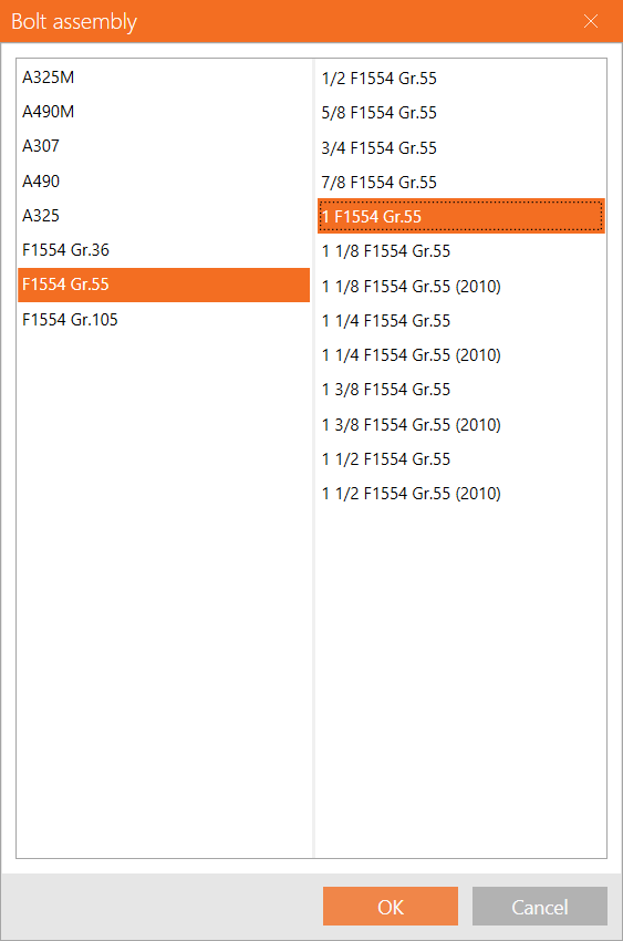 Press the + symbol next to bolt assembly type, choose 1" F1554 Gr. 55 and then press OK to continue.