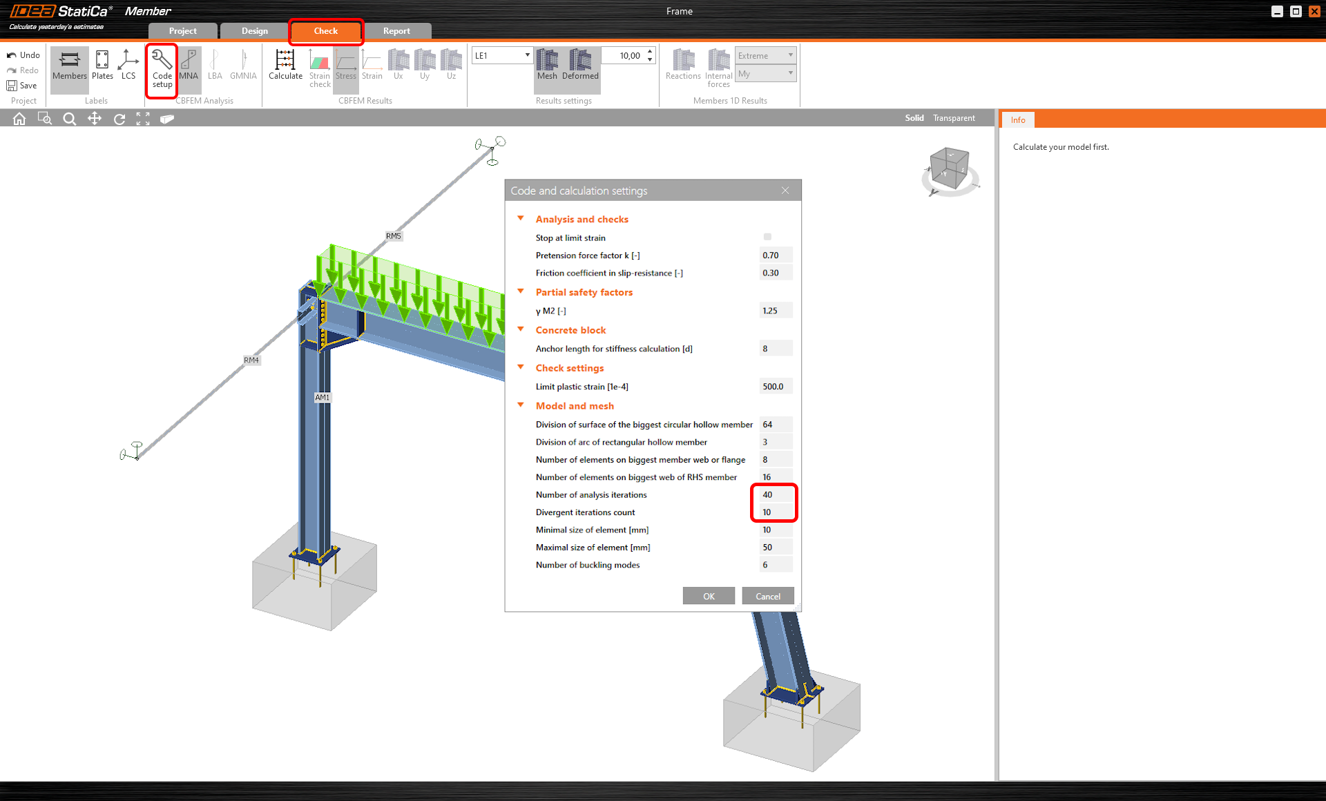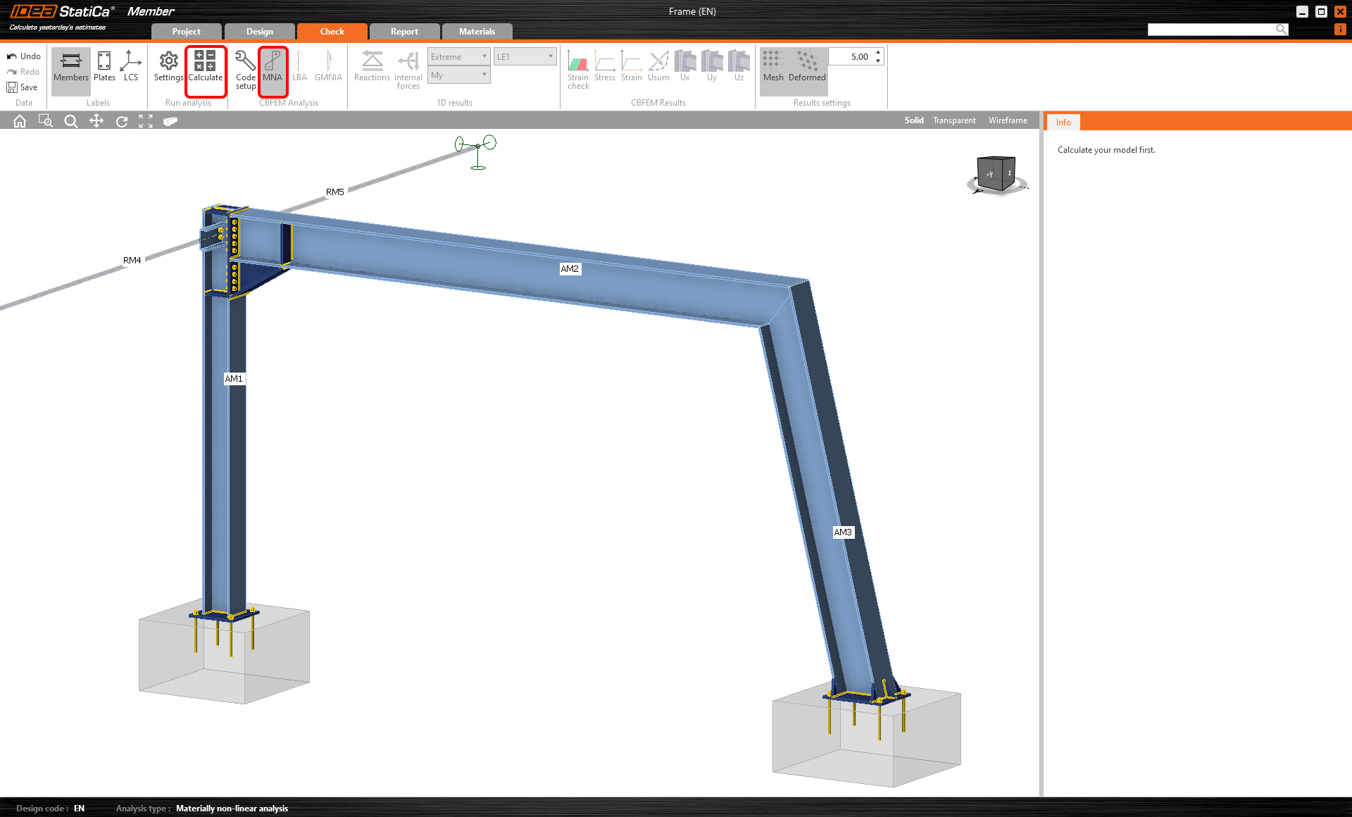 Let's proceed to the Check tab and perform the analysis. Analysis in IDEA StatiCa Member is calculated in three steps using the CBFEM technology. First, analyze the MNA (materially non-linear analysis) to check the structural capacity, then calculate the LBA (linear buckling analysis) to investigate the structural stability and finally input the initial imperfections to appropriate buckling shapes and calculate the GMNIA (geometrically and materially non-linear analysis).