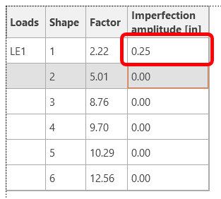 Since at least one of the buckling shape factors is less than 15, switch to GMNIA to perform the non-linear analysis of structural stability. Choose the most critical buckling shape or a combination of buckling shapes and input the initial imperfection of the critical beam. In this case, choose the first buckling shape 1 as the most critical one. Switch to the GMNIA tab in the right panel and determine the imperfection of 1/4" (L/1000 = 18*12/1000 = 0.21", say 1/4"), which you type in as the Amplitude in column 1.